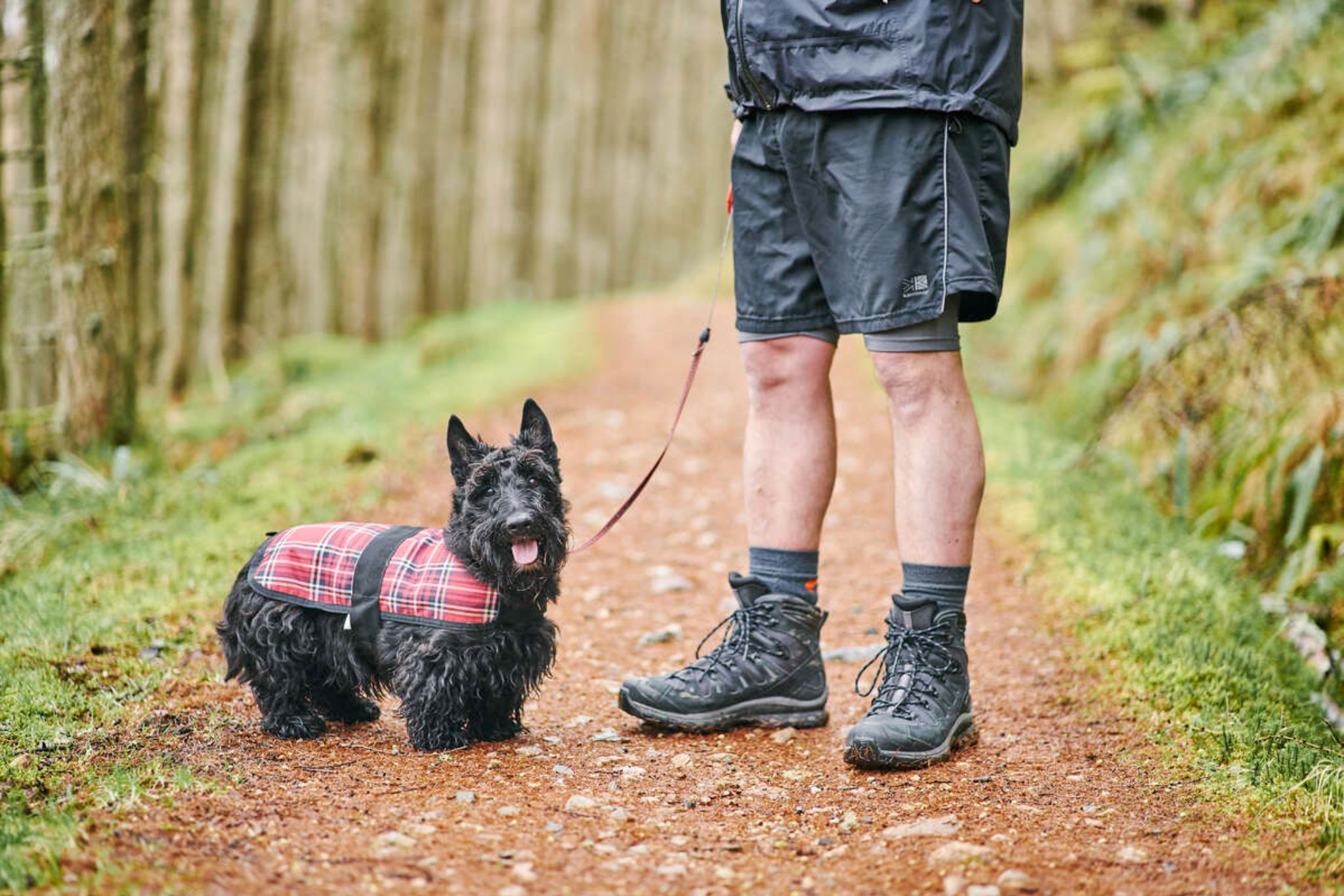 A Scottish terrier being walked along a countryside path