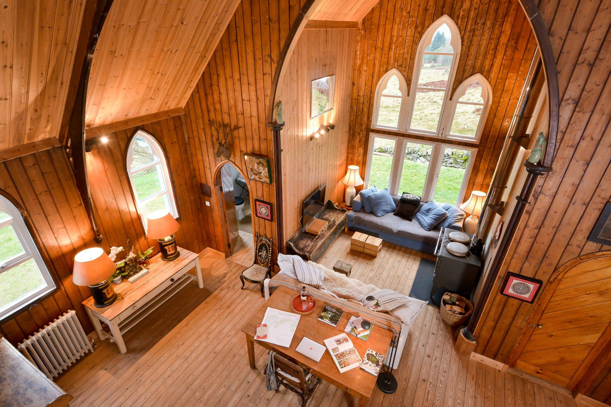 Have you ever stayed in a church? Well, The Tabernacle in Perthshire doesn’t disappoint. This renovated church is a real sight to see, with an emerald green and detailed exterior, a rustic wooden interior, a wood burner to keep you cosy, and floor to ceiling alter windows offering great views whatever the weather may be.