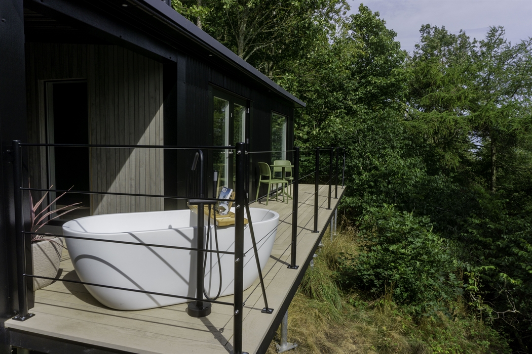 This cosy getaway for two features a stargazing window, so you can literally sleep amongst the stars, as well as all the modern conveniences you need, including a full kitchen, a bathroom with a flushing toilet and shower, full length window facing into the canopy, and it even has an outside bath, so you can really get back to nature!
