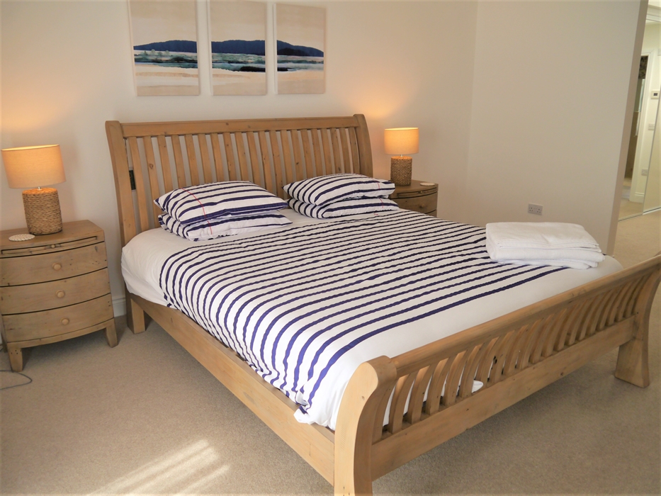 First Floor: Sitting room with wood burning stove and patio doors to balcony with views down the estuary; Principal bedroom with Super King bed and Juliet balcony, dressing area and ensuite shower room with walk in shower; Kitchen with island adjacent to dining area with door to balcony; Snug sitting room with TV and double sofa bed; Cloak room off snug sitting room with toilet & wash basin.