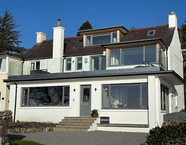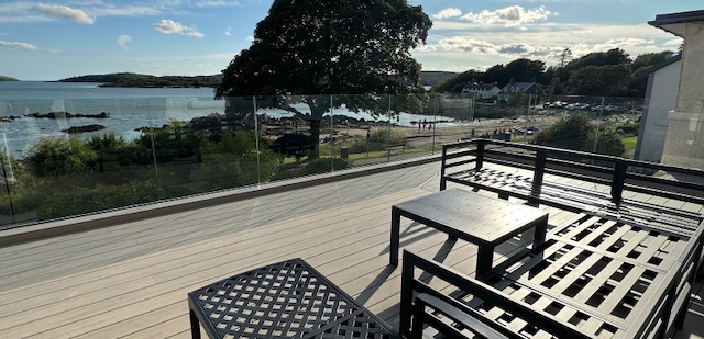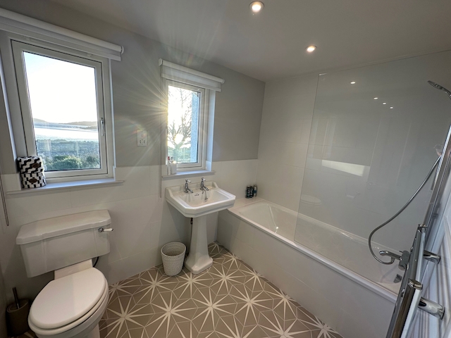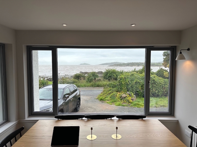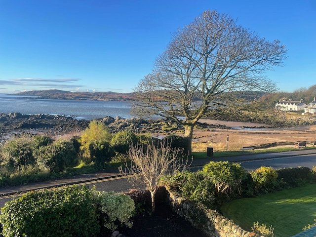Ground Floor: Five steps up from the gravelled parking area to the front entrance door into the foyer, with coat hooks and boot storage; leading to a spacious sitting room with uninterrupted sea view to both Rough and Hestan Islands and beyond, wood burning stove (with initial supply of fuel provided) and smart TV; hallway with stairs to the first floor and Cloakroom with toilet and wash hand basin; Utility Room with washing machine, condenser tumble dryer, clothes pulley, sink,, with plenty of storage for wet weather gear, boots, golf clubs and rear entrance door; Fully fitted modern Kitchen with built-in double oven and microwave, induction hob, large American style Fridge/Freezer and Dishwasher, Dining area with sea view, table for 8 and side door to patio and rock garden with garden furniture and BBQ.