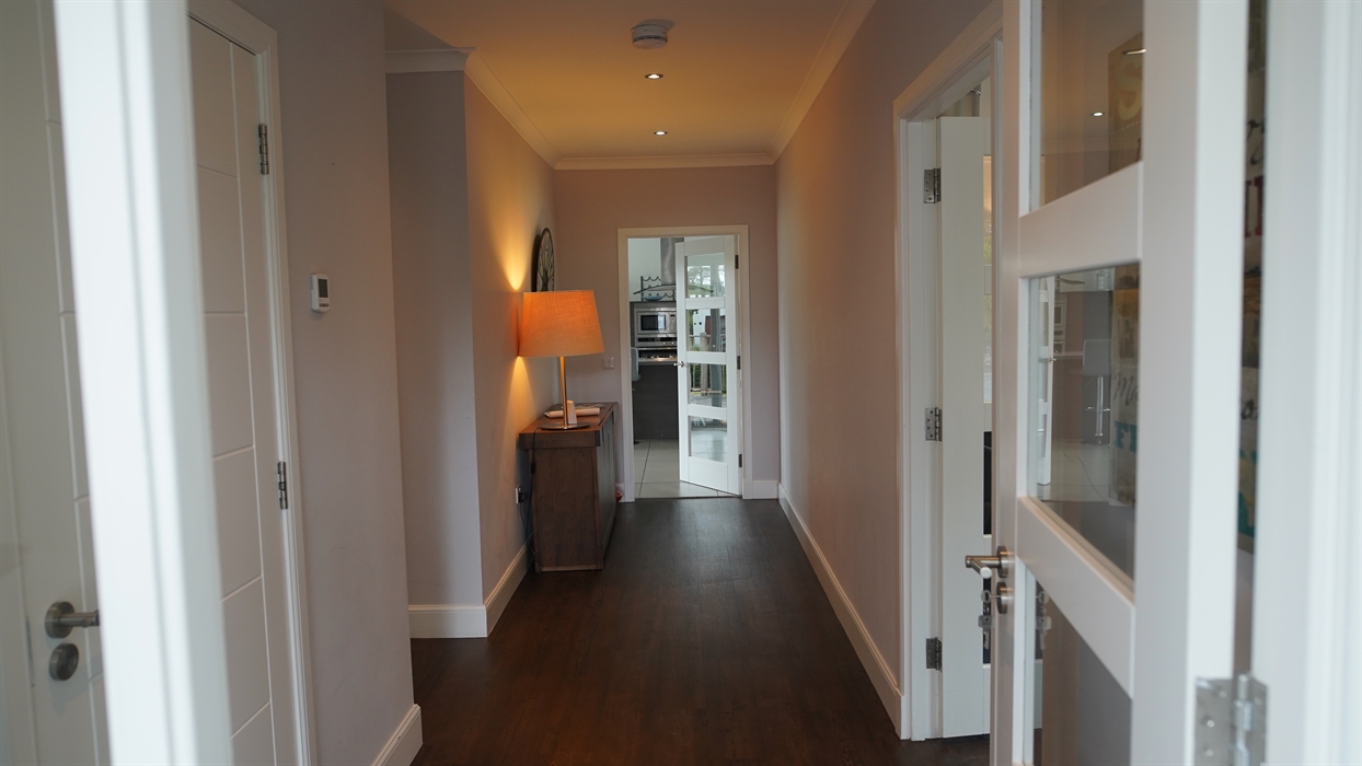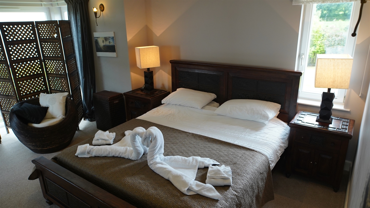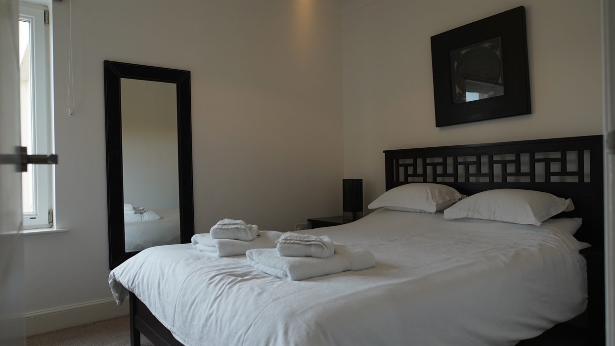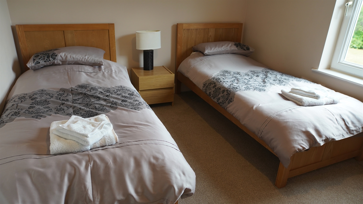 The cottage features four bedrooms. The large master bedroom includes an en-suite bathroom with a walk-in shower, a walk-in wardrobe, and a super king-size bed. The second bedroom also has a king-size bed, fitted wardrobes, and an en-suite with a walk-in shower. A twin room includes a walk-in wardrobe, while the fourth bedroom offers a single bed with a pull-out bed, allowing the house to accommodate 8 guests. The spacious main bathroom features both a bath and a walk-in shower.