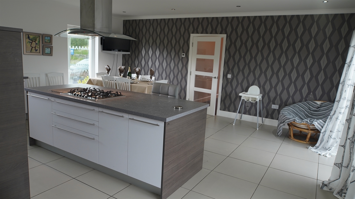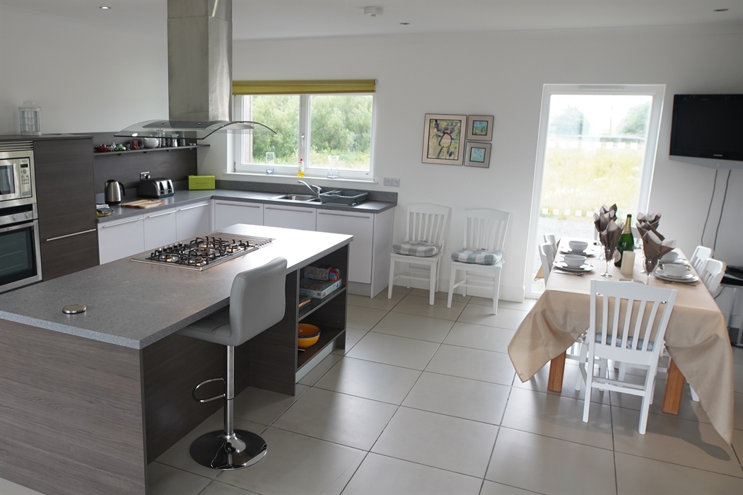 The house boasts a large, modern kitchen with seating for 8 around the dining table and a central kitchen island, making it the perfect heart of the home. This space is ideal for socialising after a day out, where cooking dinner can become a shared event. Guests can relax at the breakfast bar and enjoy views of the garden. The kitchen opens onto a raised timber deck with outdoor dining and seating options. Integrated appliances are included, with an additional fridge freezer available in the garage for extra storage.