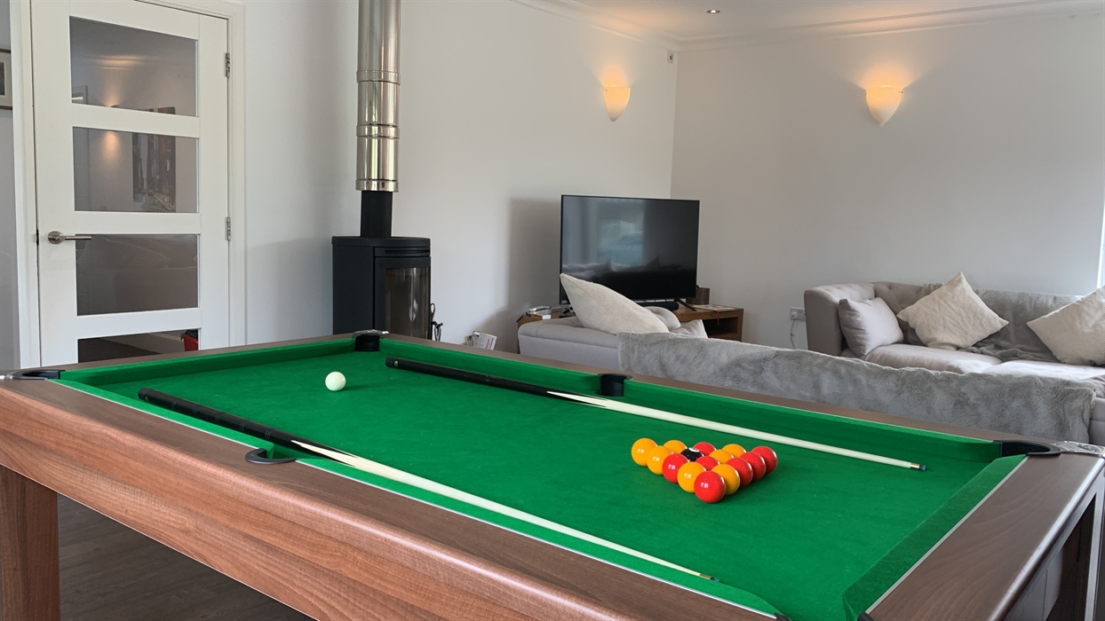 The living room is spacious and provides comfortable seating for everyone. Depending on your preference, you can watch the large flatscreen TV, admire the countryside views through the large windows, or cosy up by the log-burning stove.