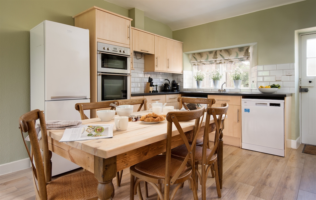 Kitchen with oven and separate grill, ceramic four-ring electric hob, large fridge / freezer, dishwasher, washer / dryer, microwave and Nespresso machine with an initial supply of pods. Dining table and seating for six guests. Access door to the rear private garden.