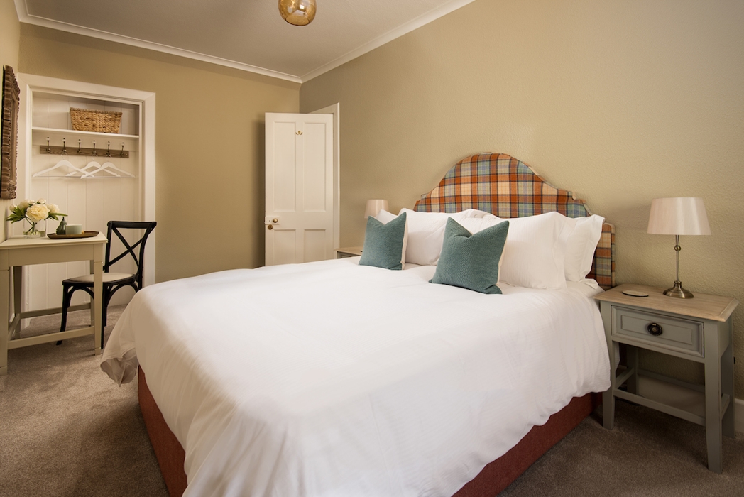 Bedroom one with fixed 4'6" double bed, side tables, console / dressing table, built-in space for hanging.