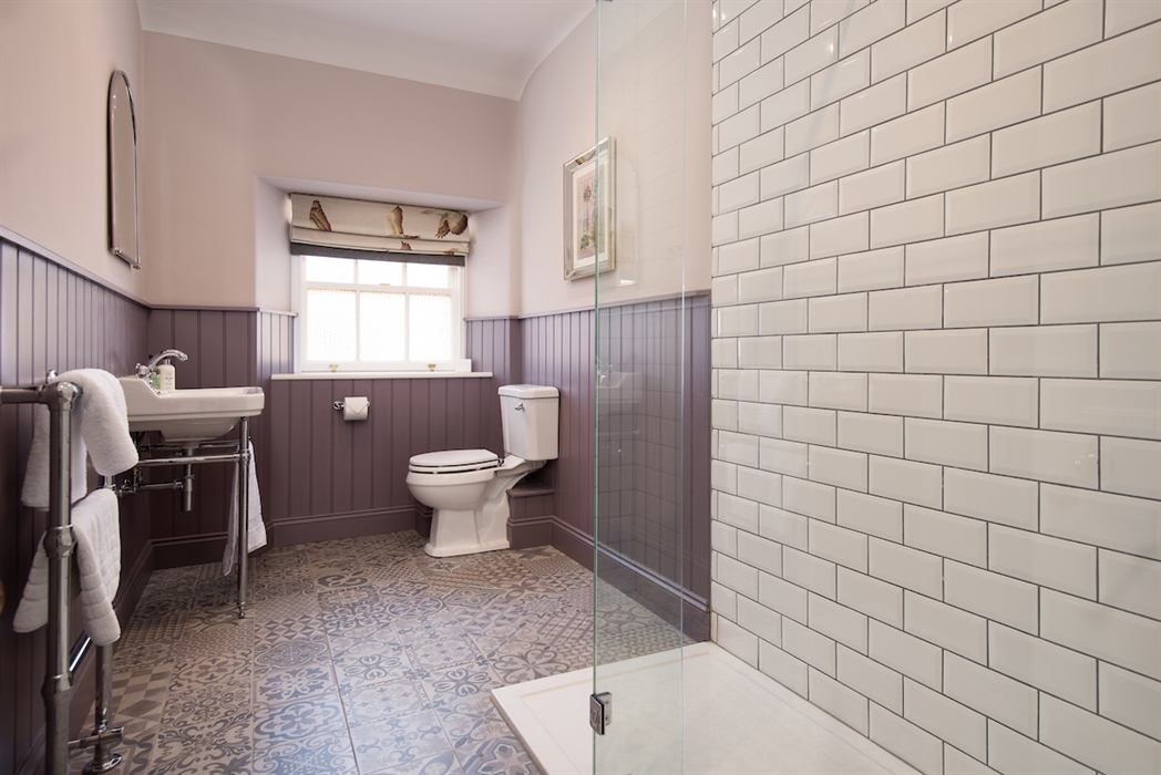 Bathroom with large walk-in shower with rainforest head and separate hand mixer, heated towel rail, basin and WC.