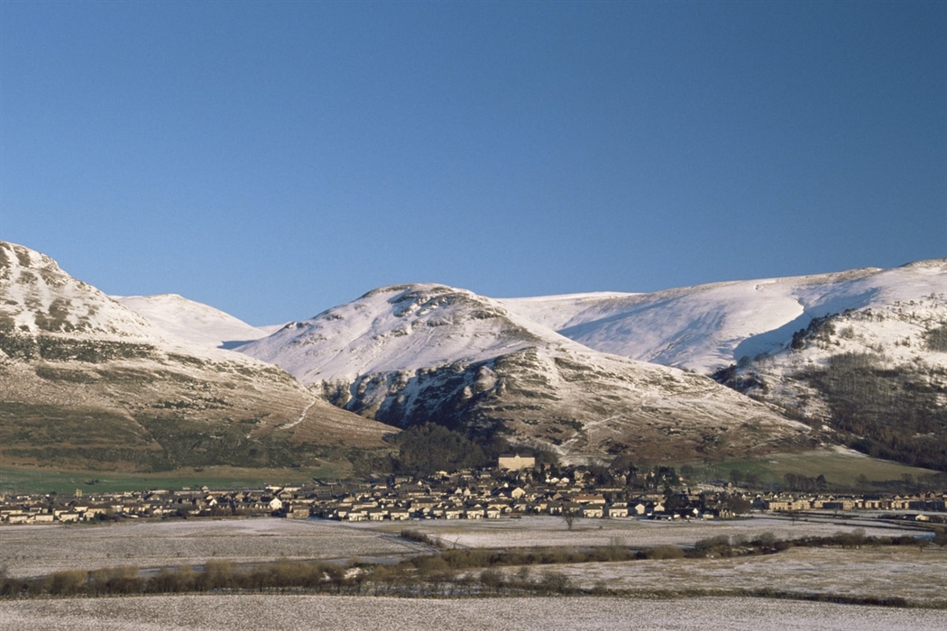 The Ochil Hills are a long range of steeply sided, round topped hills, stretching 25 miles from the Firth of Tay to Stirling..
