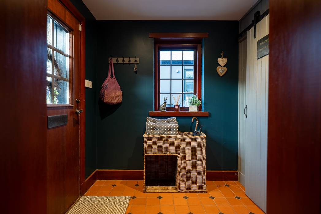 Cottage Ground Floor: 1 step down to entrance door into small hallway with storage cupboard with Washing Machine. Open plan Kitchen/Dining/Living area, Dining table with seating for 6, Living area with Woodburning stove and easy seating, doorway to rear patio and grass area with views across the surrounding fields to the city skyline in the distance. The adjoining Barn offers a relaxed space and leads to the Spa facilities with infra-red sauna, shower room and access to the wood fired Hot Tub.