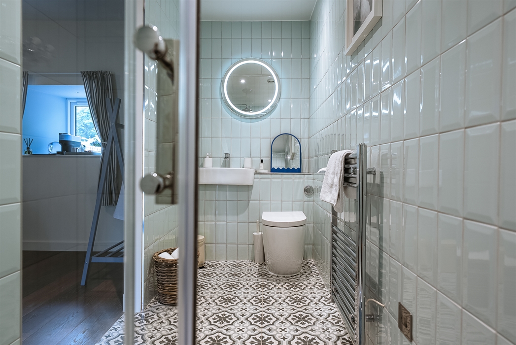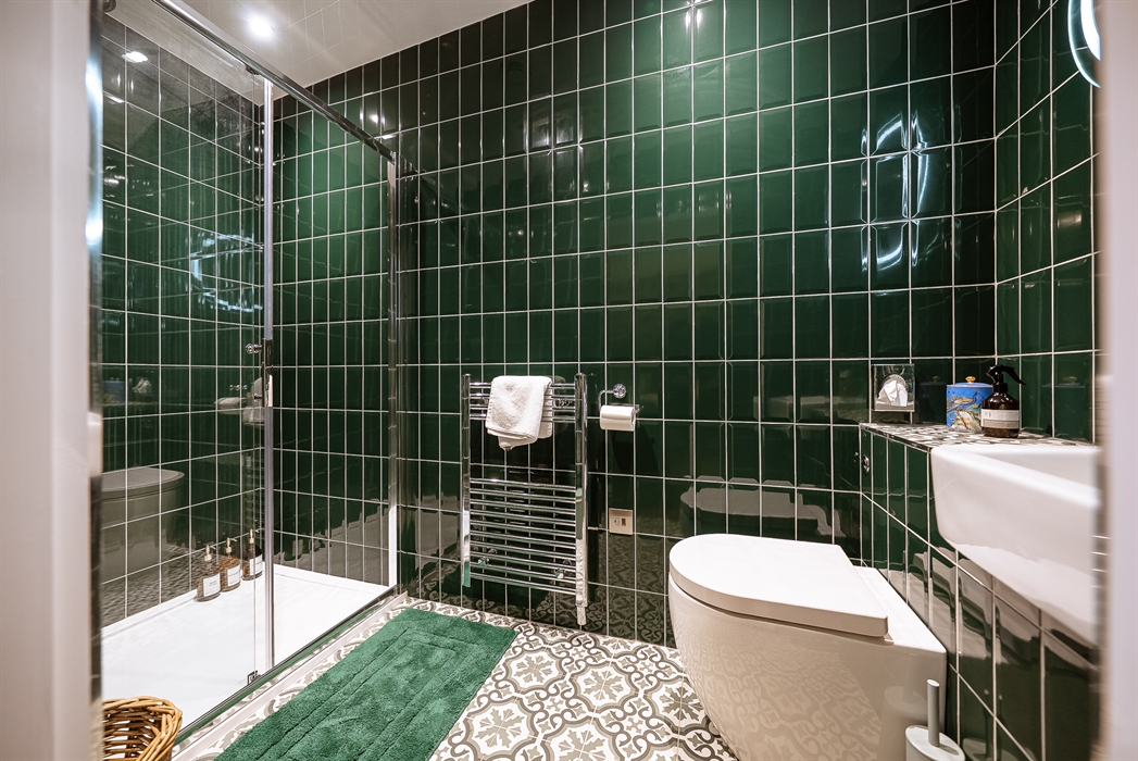 The open-plan kitchen, dining, and lounge area has been thoughtfully designed with both style and practicality in mind. The kitchen is fully equipped with everything you need, including a Nespresso coffee machine for your morning pick-me-up. Gather around the dining table for six or, when hosting larger groups, make use of the additional dining room that seats 16. The inviting living space features a woodburning stove and soft seating, ideal for unwinding after a day of adventure. A glass-panelled door opens directly to the rear garden and patio, where sweeping views of fields stretch out towards the distant city skyline.