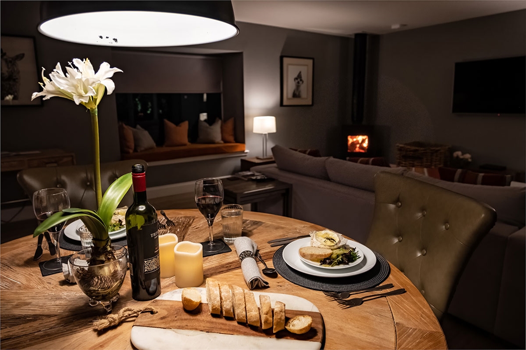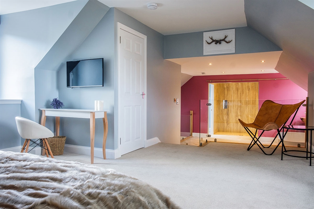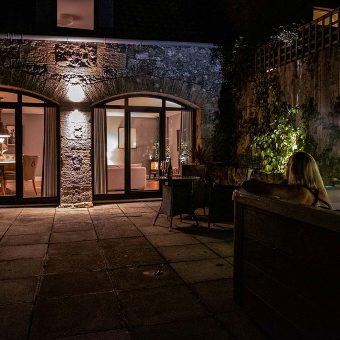 This architecturally designed steading conversion is a truly romantic rural sanctuary. The home has breathtaking countryside views and a generous amount of space for a couple to privately relax. The open plan master suite overlooks a private spa with underfloor heating, sauna, freestanding stone bath, double shower, and private outdoor hot tub.