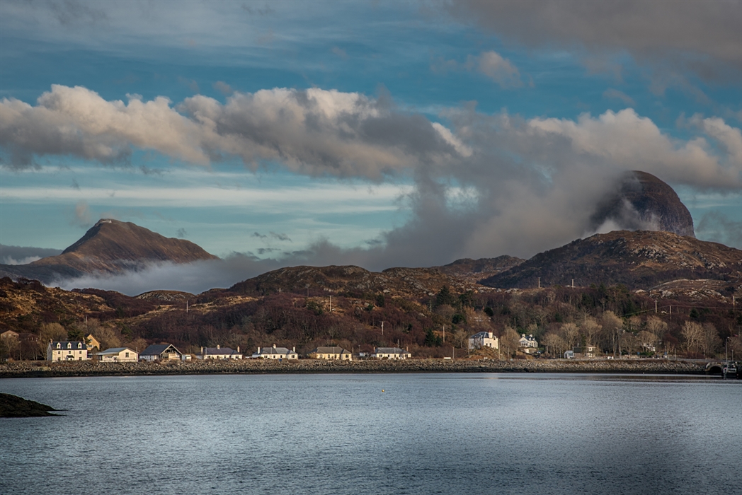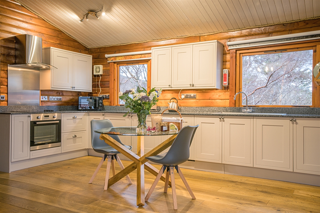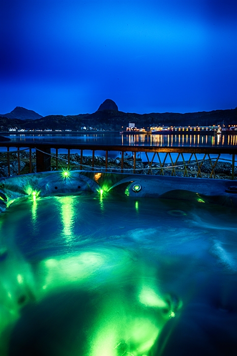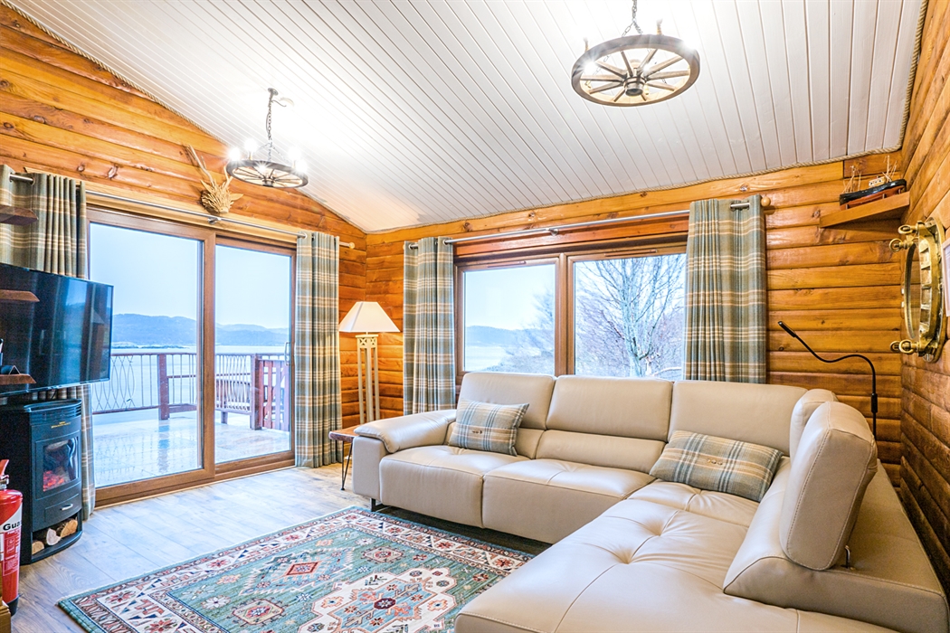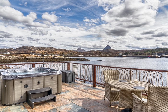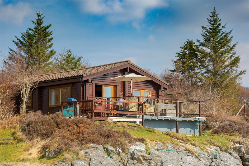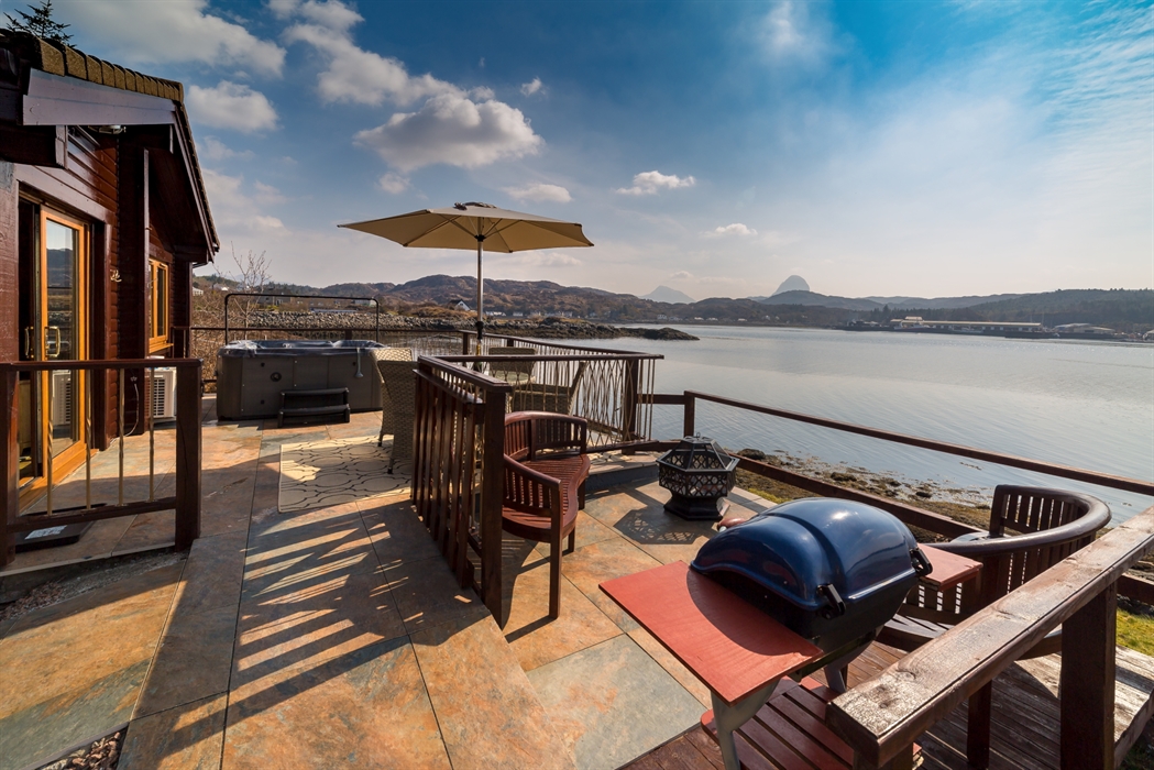 Muir-Lan log cabin on the waters edge of Lochinver bay private hot tub on your balcony.