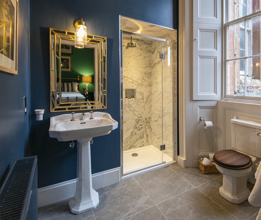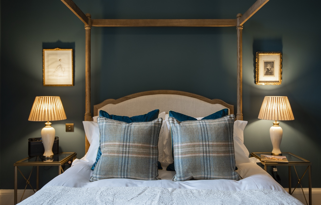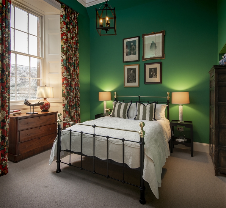 The coral walls of the master bedroom highlight the vintage-style bed hanging while its luxurious ensuite is a calming shade of Wedgewood blue. Original bedheads from when the castle was used as a hospital in the First World War complete the room. The bold colours and intricate Schumacher ‘Chiang Mei Dragon’ fabric in the second bedroom offers a nod to the castle’s links with Asia. The 15th Countess’s father was J. J. Bell-Irving, a very successful Hong Kong banker and merchant, and he brought many items back with him which can be seen throughout the castle. The opulence continues in the ensuite shower room with vintage gold taps. The high ceilings throughout the apartment enable a grand four poster bed to be used in the third bedroom. The large windows frame stunning views across the castle estate.