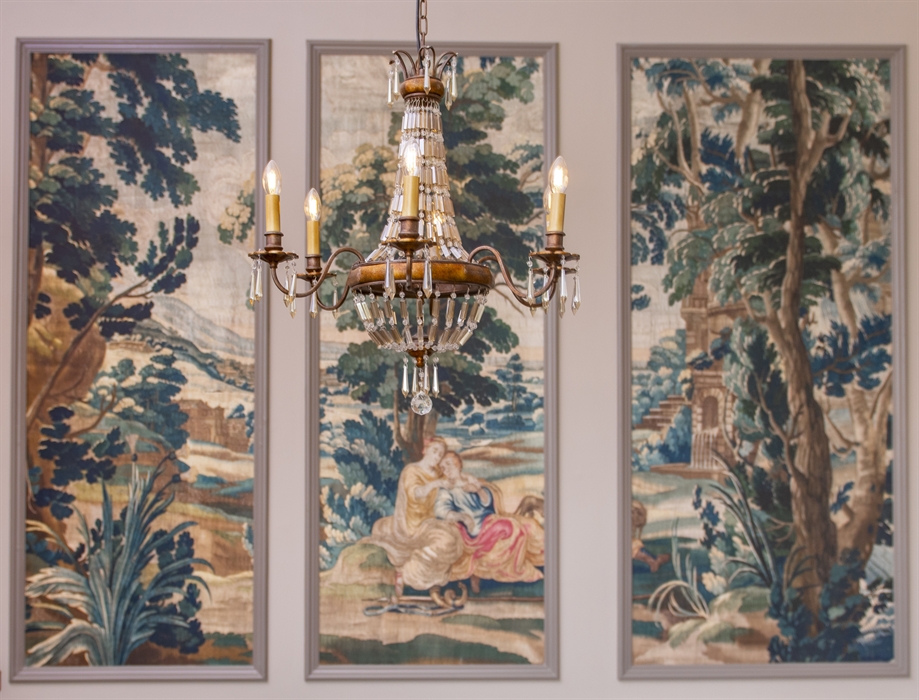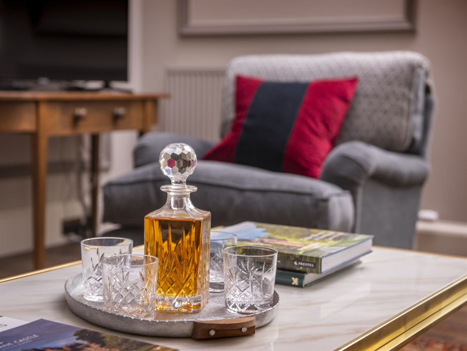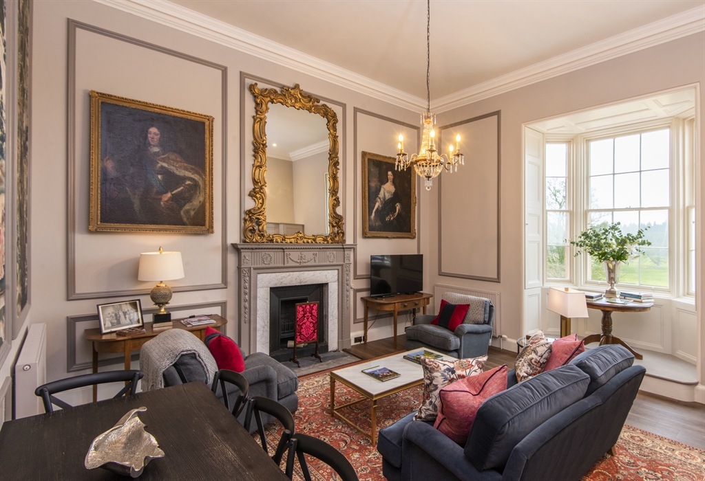 The main reception room is an open-plan space dominated by a large gilt mirror that until recently hung in the State Drawing Room of the castle. The chandelier casts a soft light over the portraits, one of which is by John Scougall, and the bespoke wallpaper panels featuring designs from an historic antique tapestry. Watch the sunset in the evening over the parkland from the large west-facing bay window.