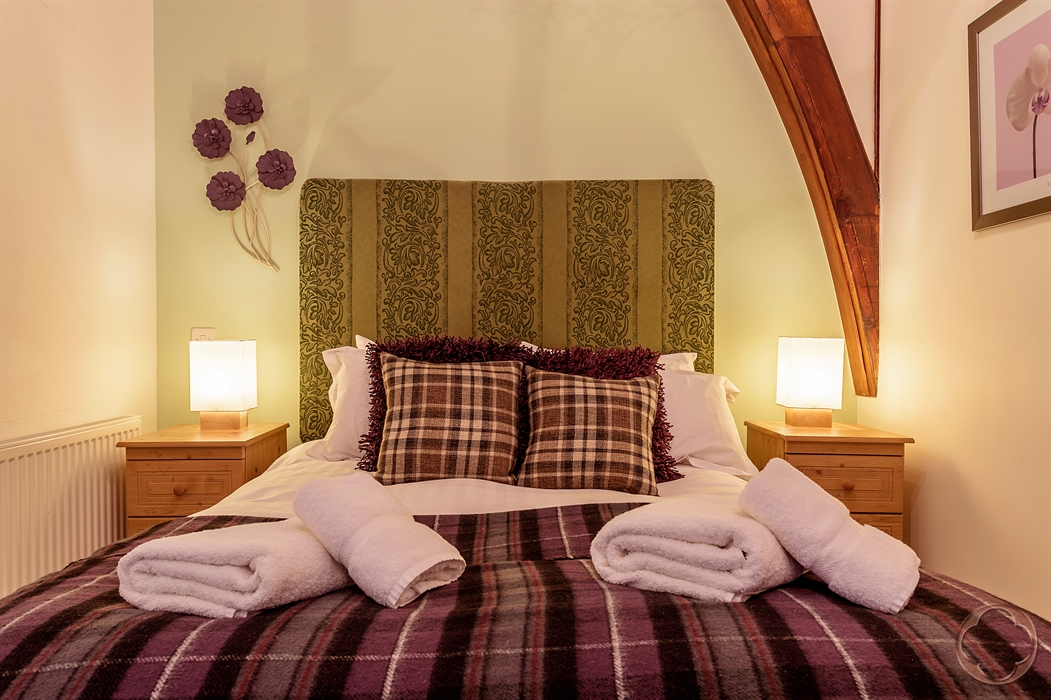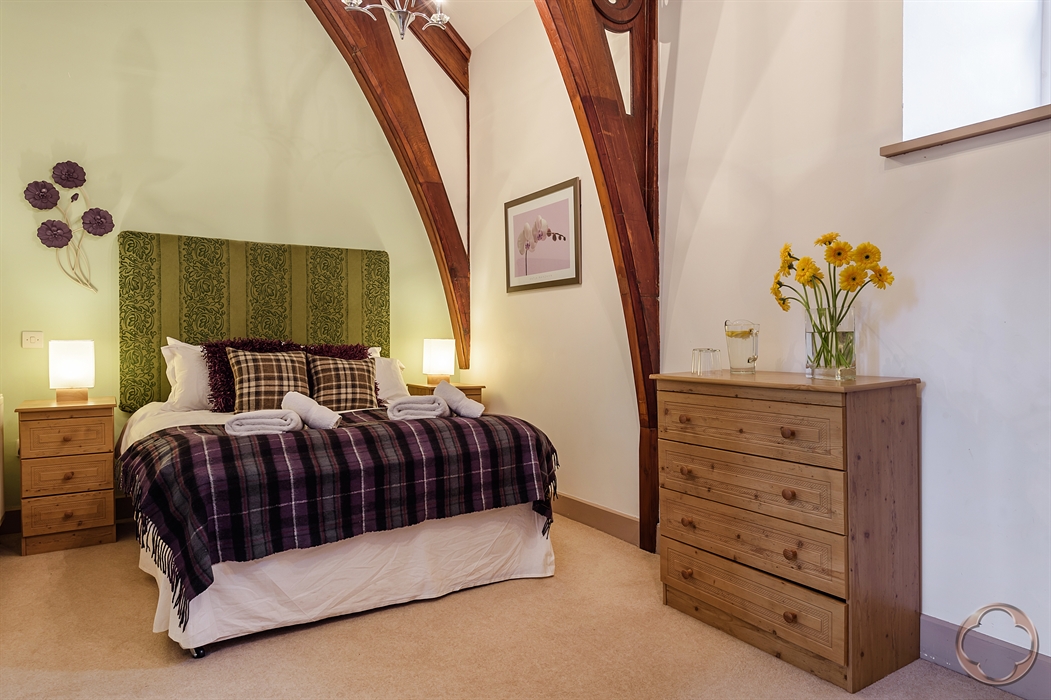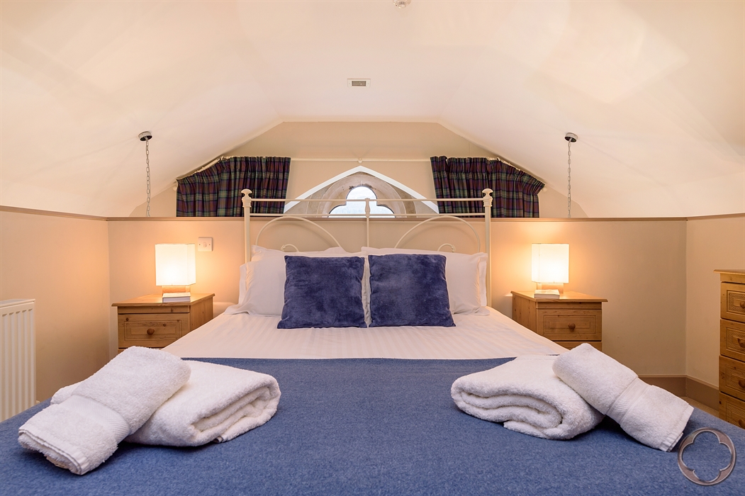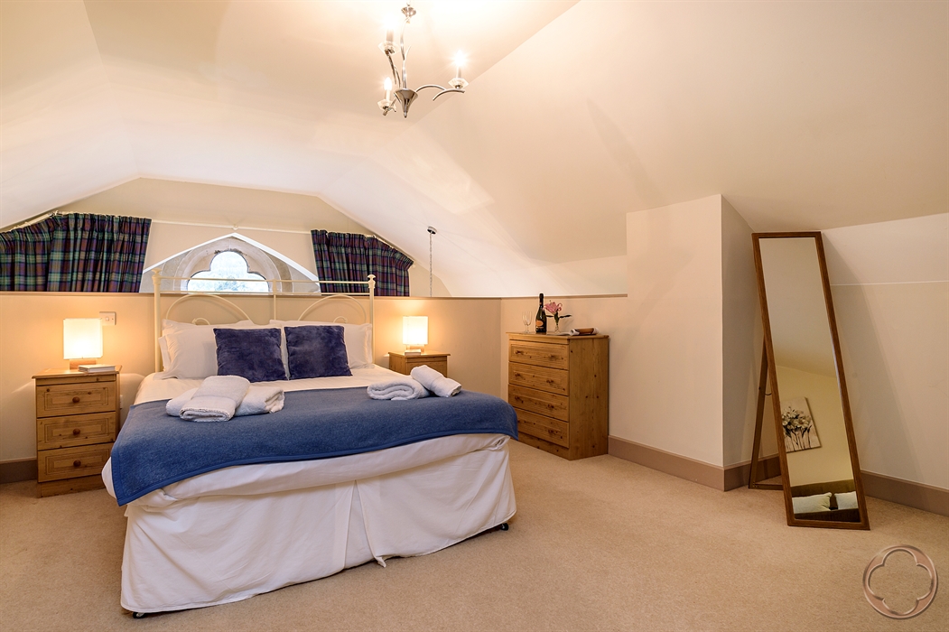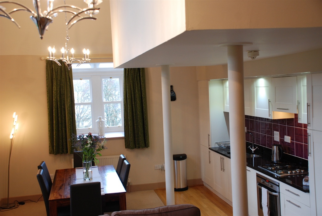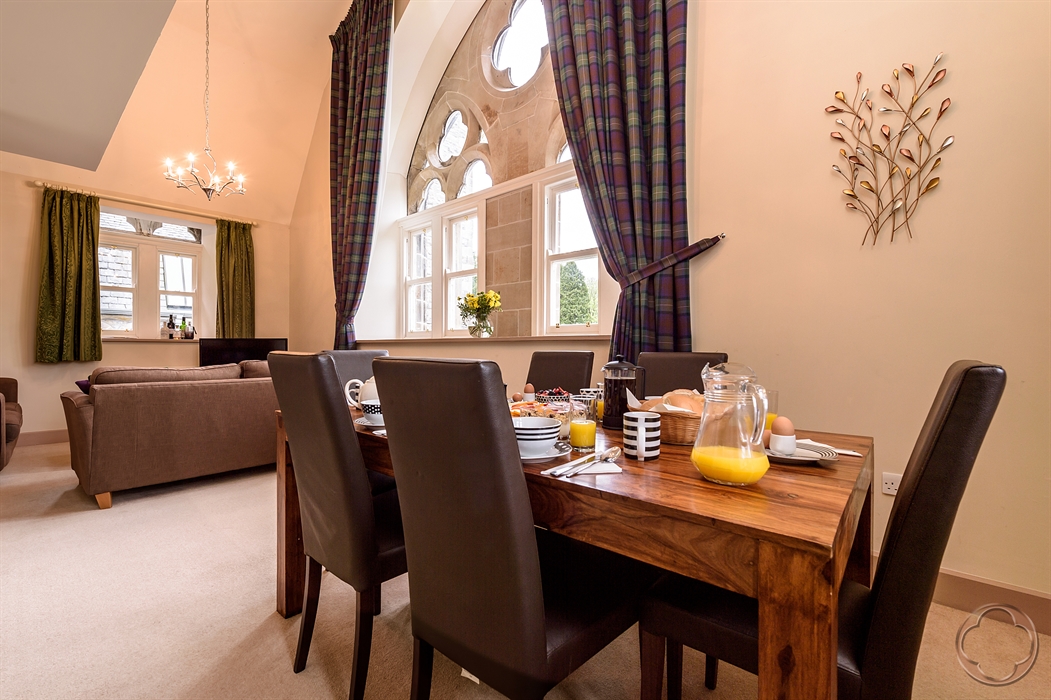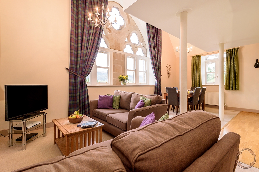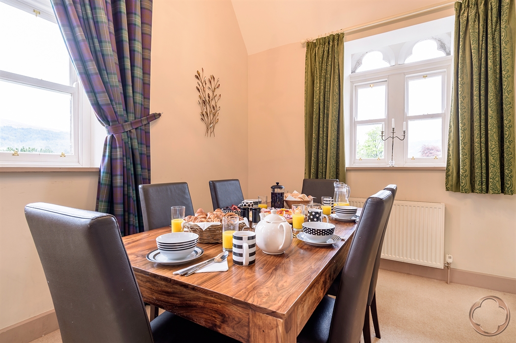 The large window floods the open-plan living and dining area with natural light and offers picturesque views of the Old School lawn and the Highland hills beyond. The accommodation comprises two double bedrooms and one twin room, comfortably sleeping up to six guests.