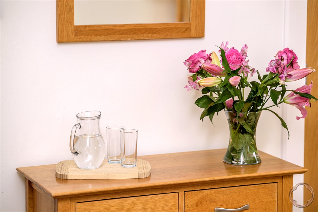Tastefully finished with oak flooring and elegant decor, the apartment’s interiors offer warmth, character, and modern comfort. The spacious master bedroom includes a luxurious en-suite bathroom featuring a roll-top bath — perfectly positioned to take in views of Borlum Hill and the surrounding countryside.