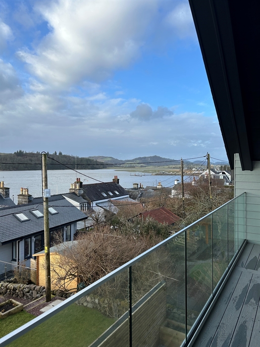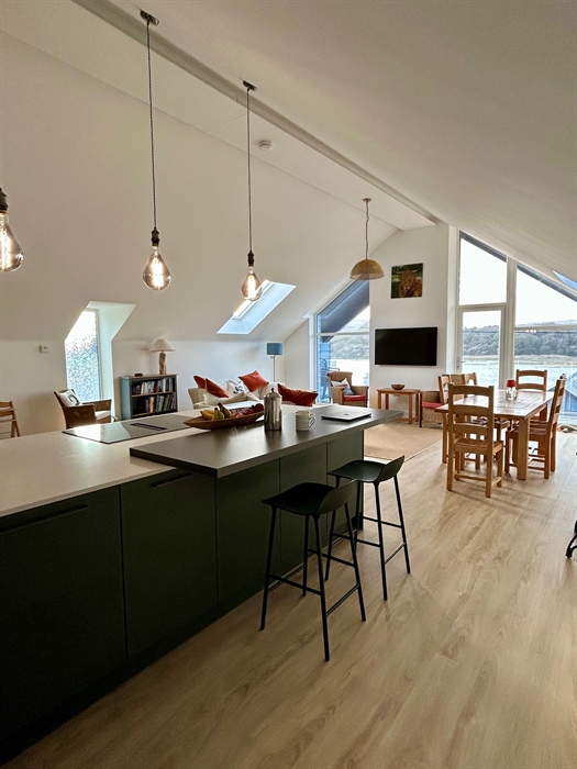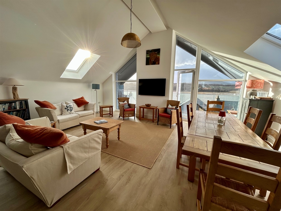 Upper Level: Open plan kitchen/dining/living space; Large well-equipped kitchen with induction hob, electric double oven and warming drawer, fridge freezer, dishwasher; Dining table for up to 6 guests; Comfortable living area with smart TV; Access to upper balcony with views both up and down the estuary; separate WC.
