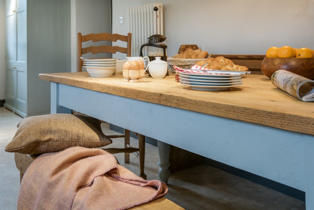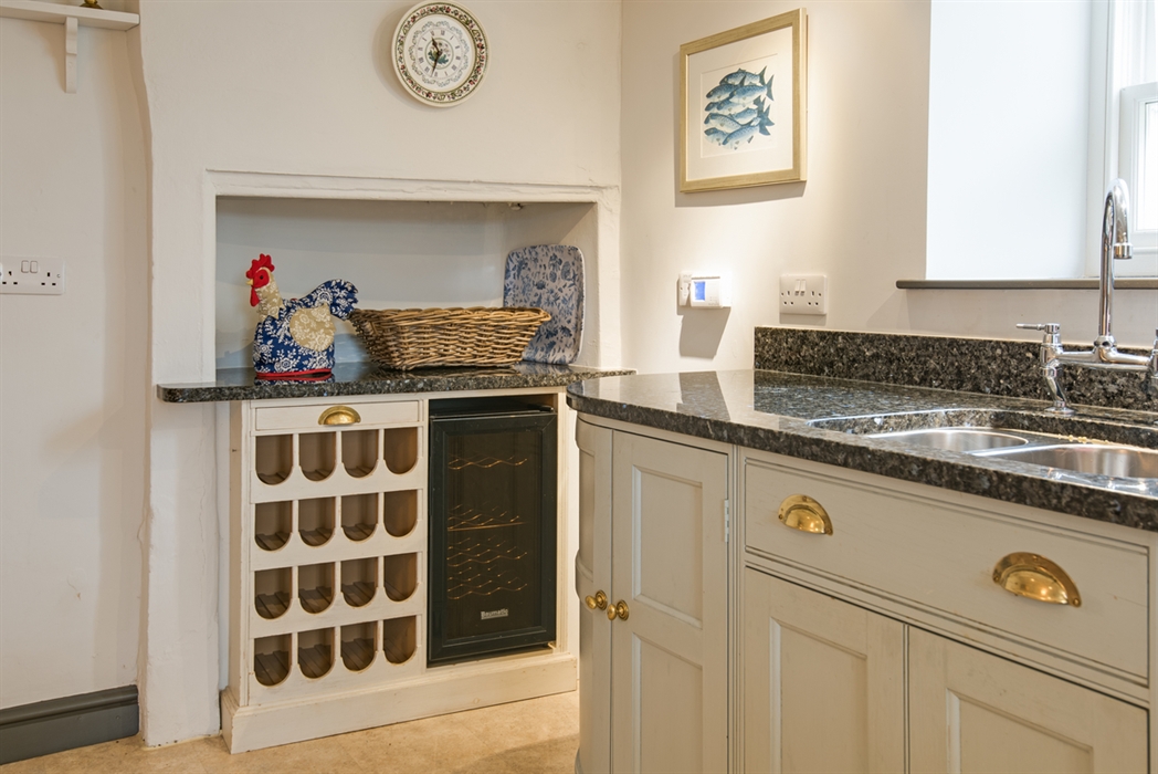 Fully equipped handmade dining kitchen with large fridge/freezer, microwave, a wine fridge, dishwasher and breakfast table and chairs.