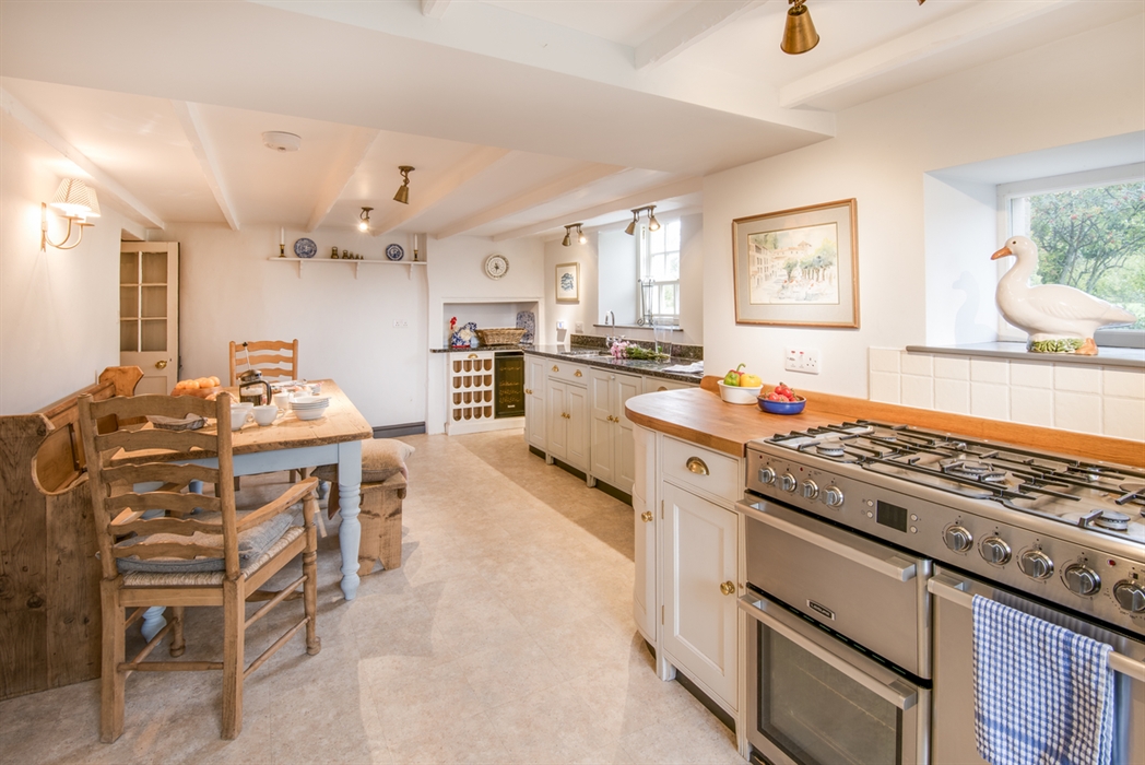 Abbey House has the feel of a wonderful country home, presented to a high standard throughout including a superb handmade kitchen and four beautifully-presented bedrooms each with their own bathroom. The cosy interior makes the most of the many charming, period features including an original inglenook fireplace and bread oven, Venetian style windows and a restored open fire place in the sitting room. The style is one of relaxed elegance with classic furnishings, cosy fabrics, stripped wood floors in the dining room and drawing room and many interesting antique pieces dotted around the house.