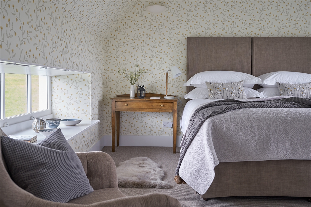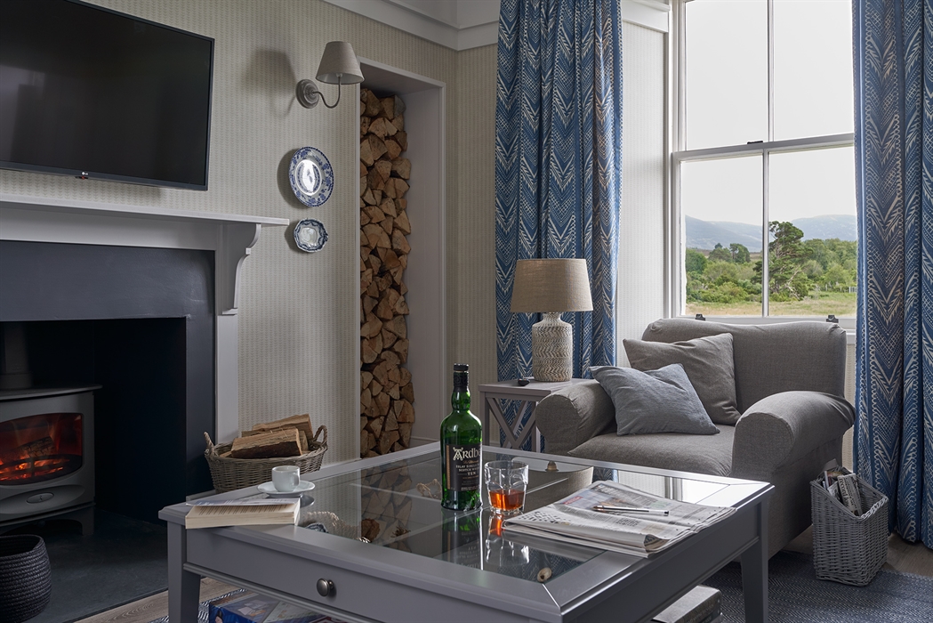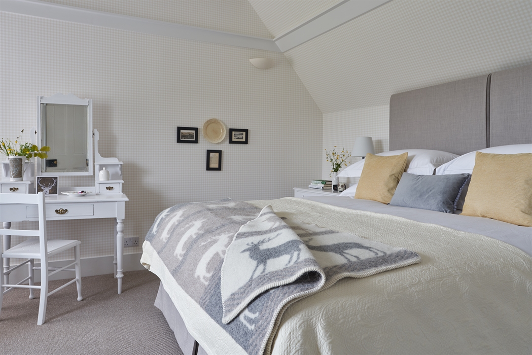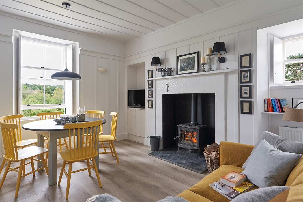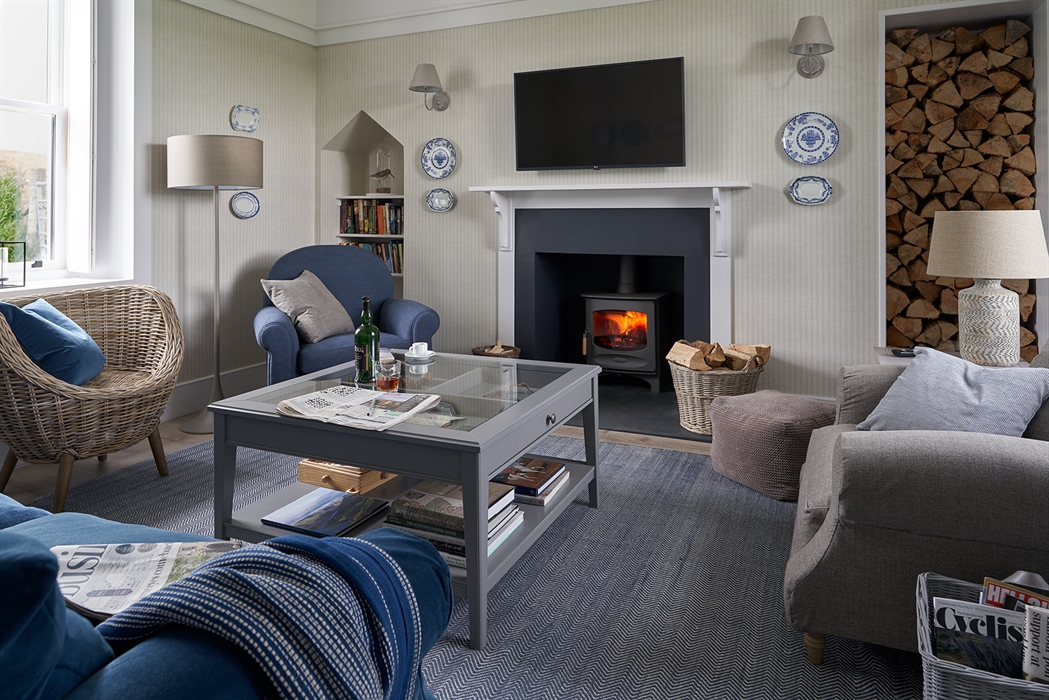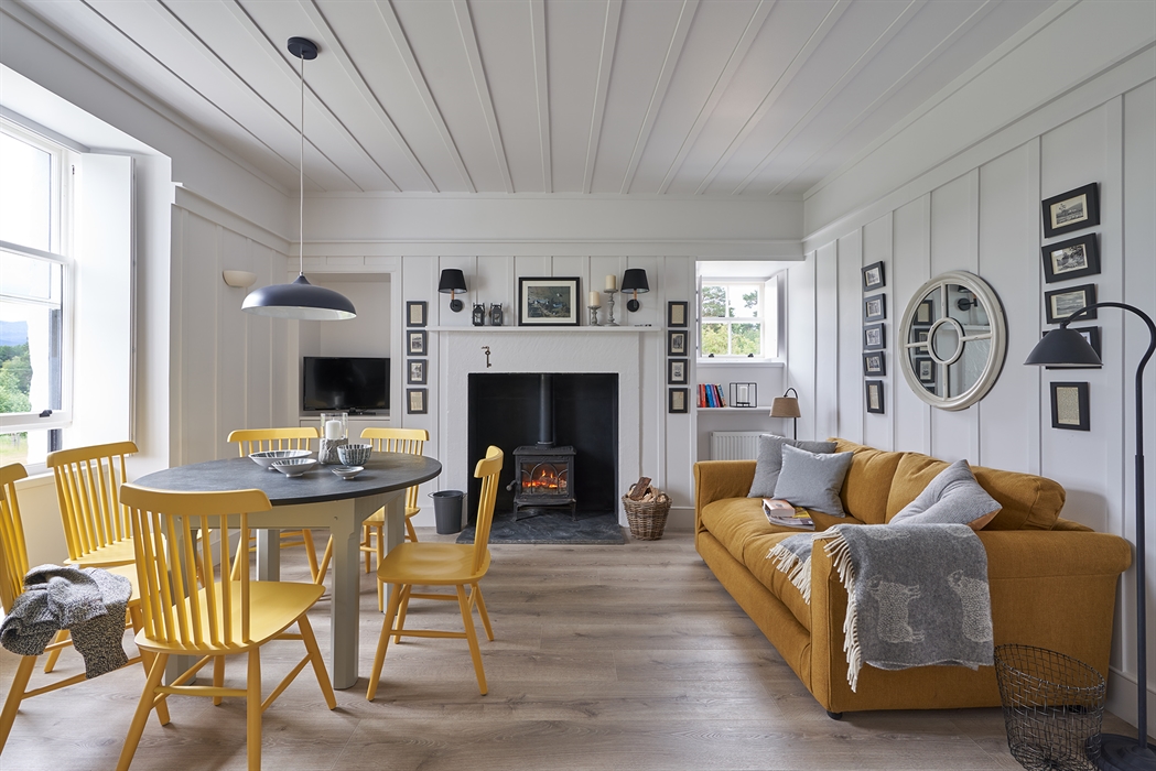 London-based stylist and interior designer Fanny Ward designed the interiors in a modern Scandinavian style to be light and bright, practical but pretty. Her trademark quirky touches are everywhere - like a big statement chandelier above the staircase and lots of blue and white pottery on the walls. The sitting room is welcoming, warm and comfy - a perfect place to unwind with a dram in front of the wood burner after a day on the hill.