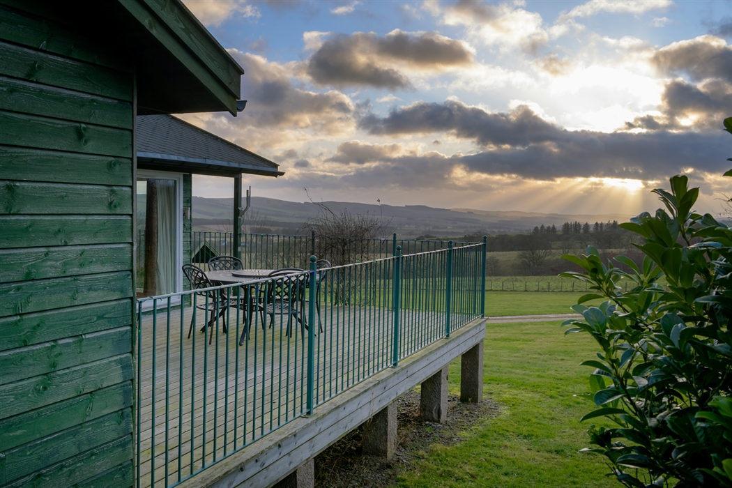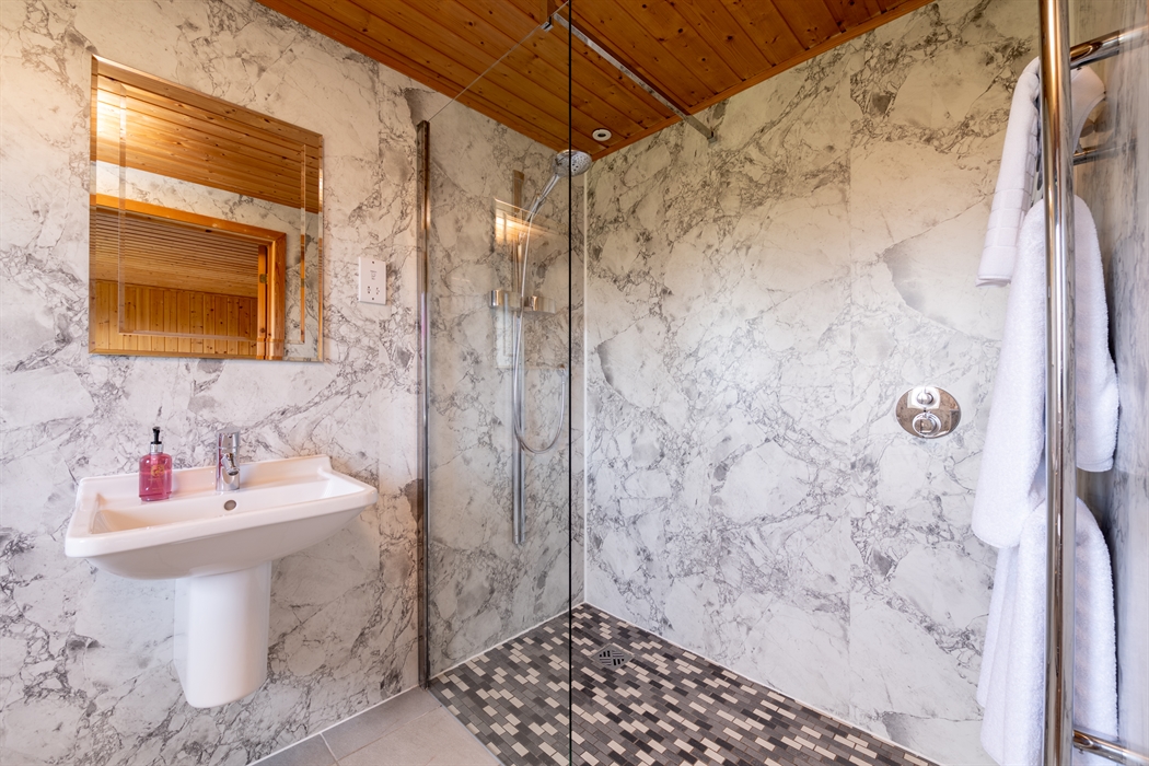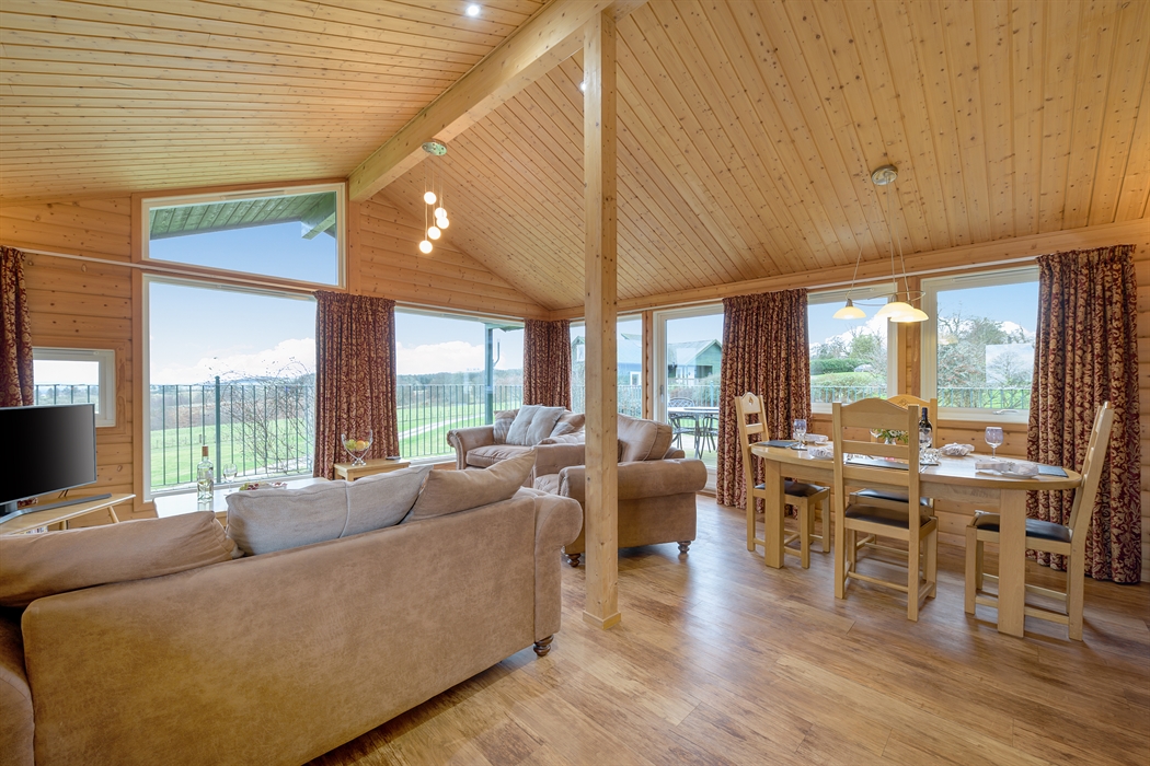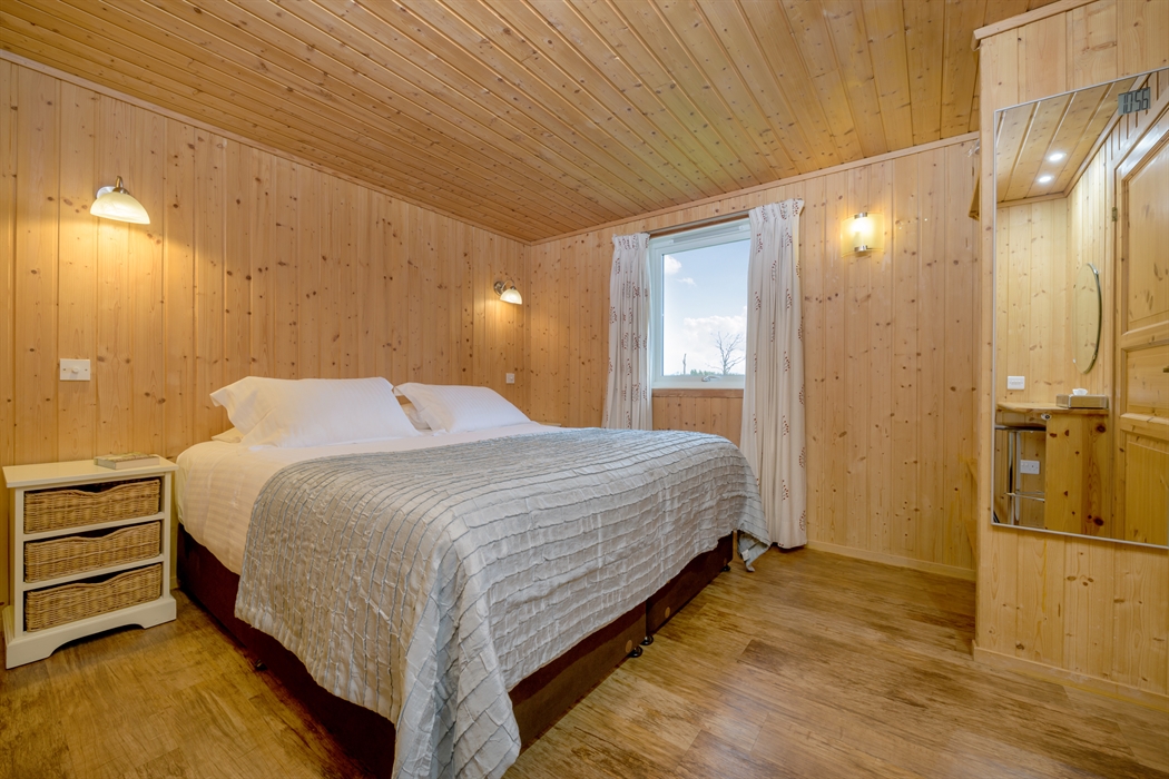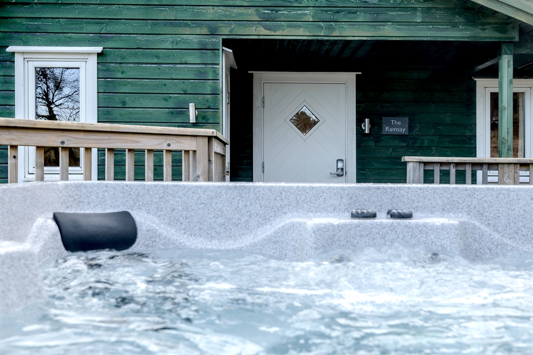 The Ramsay Lodge comfortably sleeps six guests in three super king-sized ensuite bedrooms—one of which can be split into twins, making it ideal for families. Outside, a two-tier wraparound deck provides the perfect spot to soak in the scenery, while the huge, sparkling-clean private hot tub just outside the door invites you to unwind under the stars.