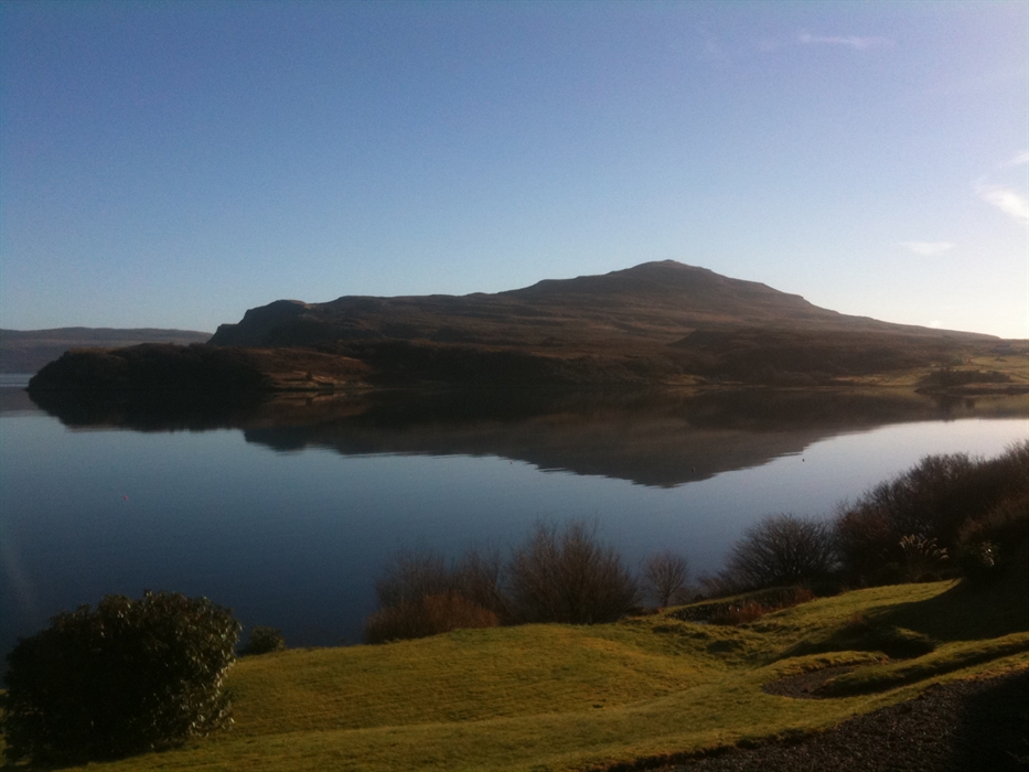 The scene was idyllic, glorious sunshine, calm sea and the surrounding hills reflected in its browns greens and purples. The place was Fisherfield on the shore of Loch Portree in the beautiful Island of Skye - (The view from An-Airidh)