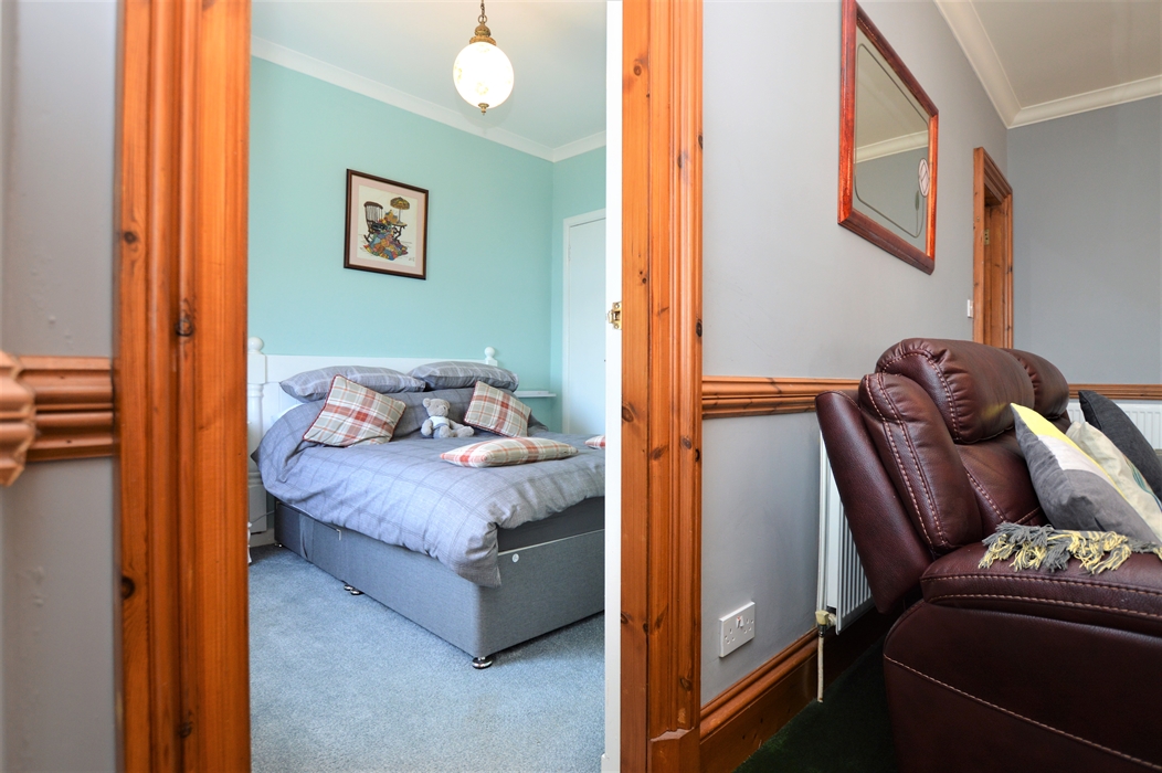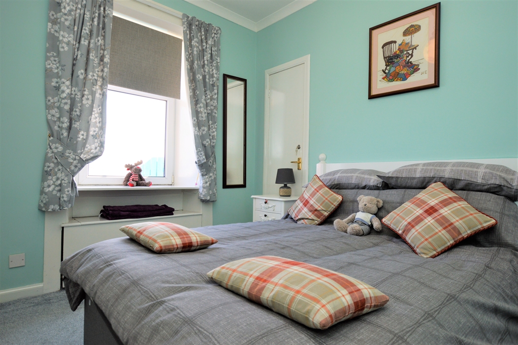 Bedroom 1: Large double bed with, wardrobe, bedside tables, sea views.