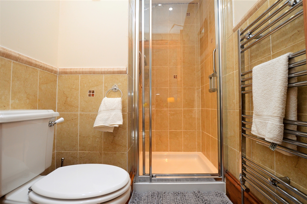 Modern family bathroom features walk-in shower cubicle, hand basin, mirror and heated towel rail.