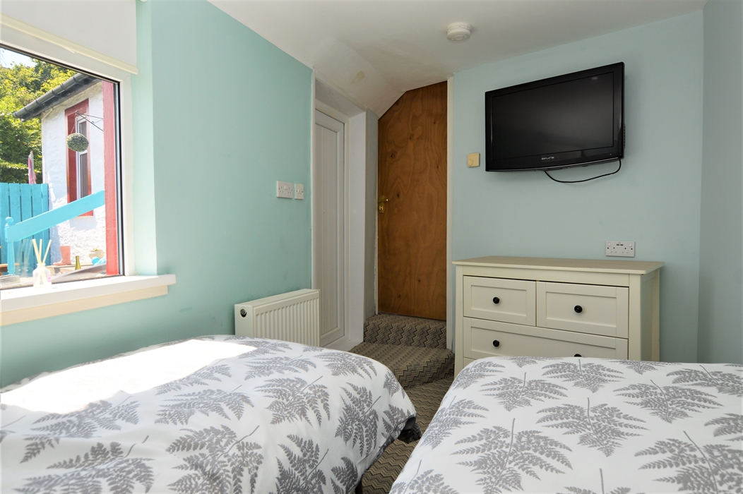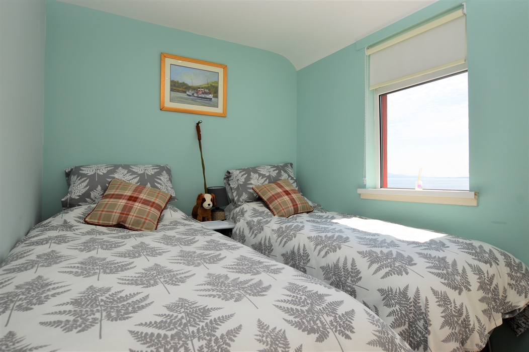 Bedroom 2: Two single beds, TV, dresser cupboard, bedside table, side sea views.