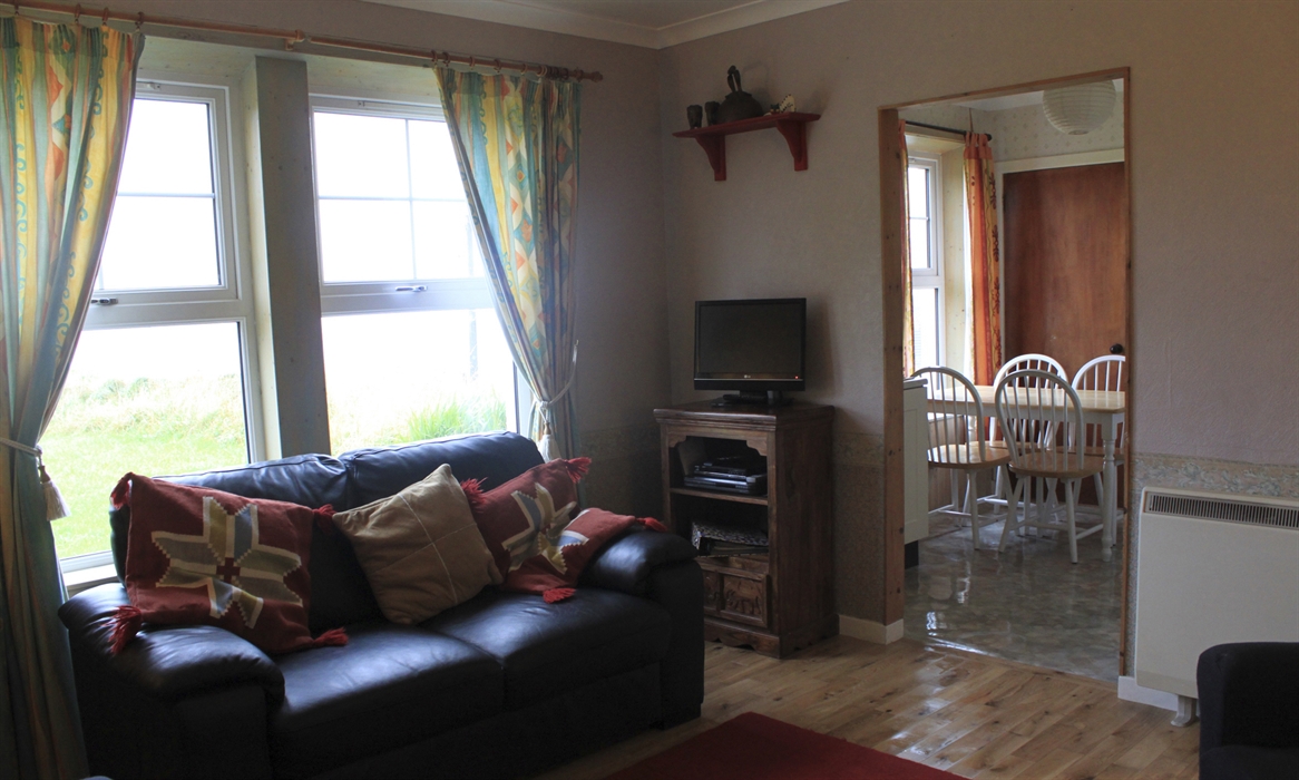 The upstairs gallery bedroom is wonderfully romantic, with a canopy bed in glorious colours with celtic inspired drapes. Candles, flowers, and quirky old photos endear this room as a very charming island retreat. Lie at night and enjoy the stars and moon in the skylight window. If you leave the blackout blind open, sunrise will greet you with a warm rosy good morning, while evening sunset engulfs you in a rich golden glow. Downstairs the second bedroom has calmer colours reflecting the seashore. The bed is canopied and again with welcoming flowers and soft light this room is gently relaxing. Overlooking the front garden, it faces east so sunrise again welcomes the day, if you choose not to draw the thick window drapes. The bathroom with Jacuzzi and candles invites you to truly relax after an energetic day out or simply pamper yourself because you deserve it. The living room has fabulous sea-views, easily enjoyed from the fireside whose cosy wood-burning stove invites you to sit back and chill out! Characterful old island photos and inspiration from the outdoors will inspire your escape from everyday life. Freesat TV, WiFi and DVD are. The kitchen diner, open plan off the sitting room makes mealtime planning more sociable. The table is by the window again with views over the croft to the sea.