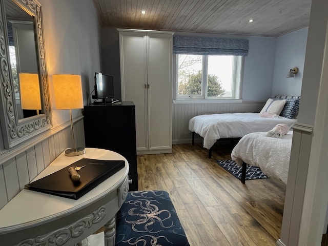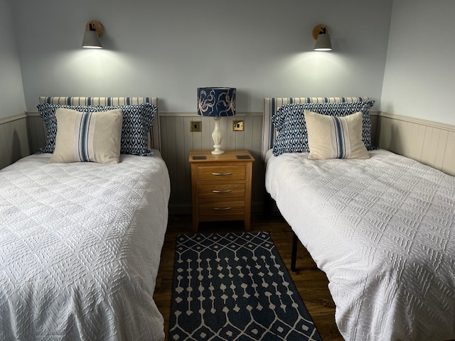 Ashaig offers two private, west-facing ensuite guest rooms. One room has a king bed, and the other, two single beds. Bathed in natural light, colours for each room have been consciously chosen to evoke sea and sky. Striving for a unique aesthetic, décor for each room has been thoughtfully curated with coastal-inspired accents and a fusion of modern and vintage furnishings. The entire property has ground floor accommodation and a ramp for step-free access.