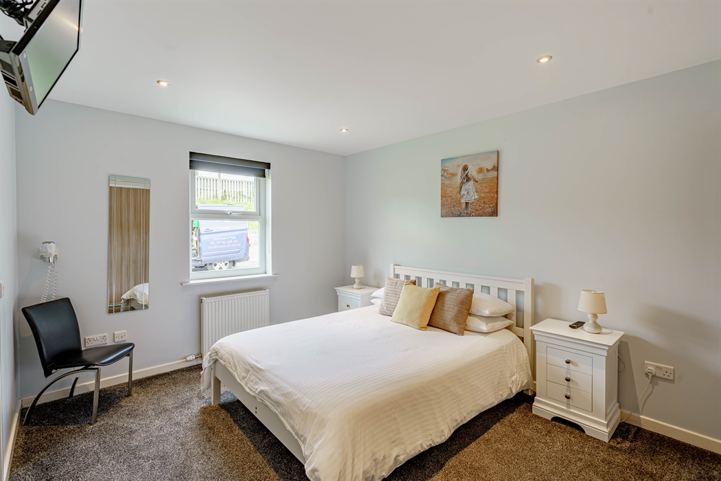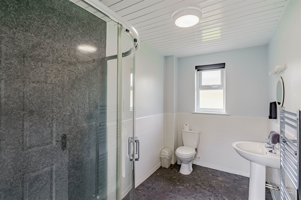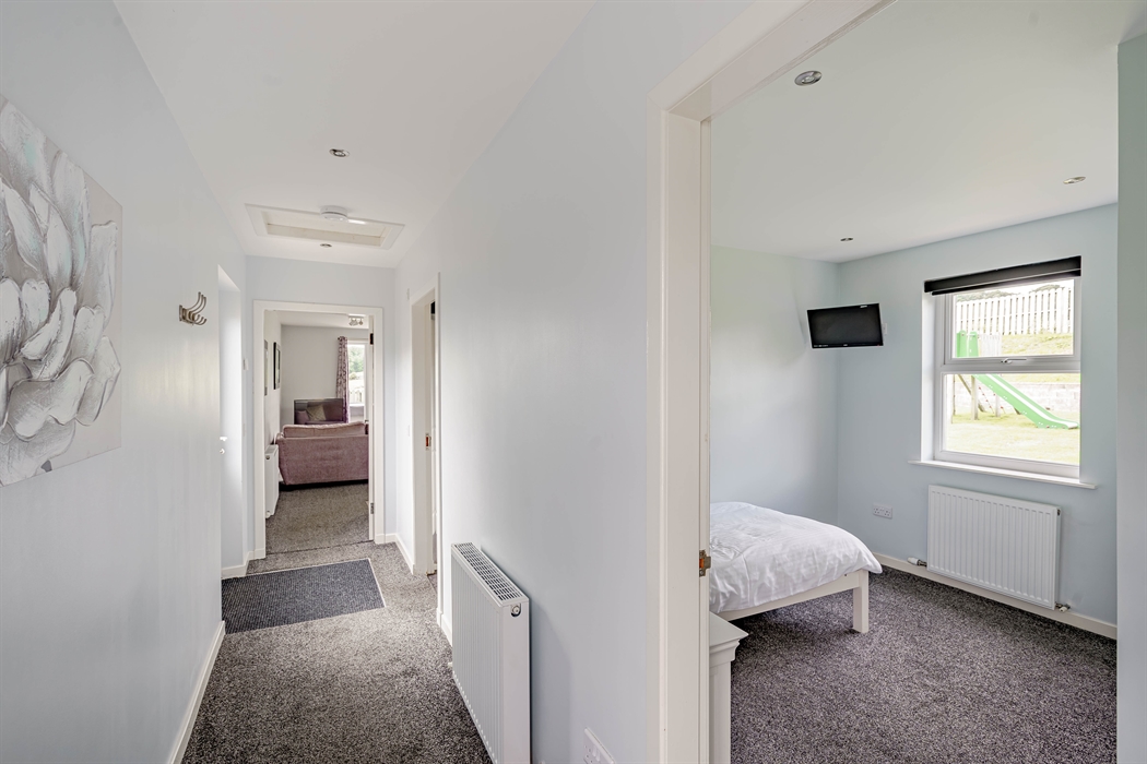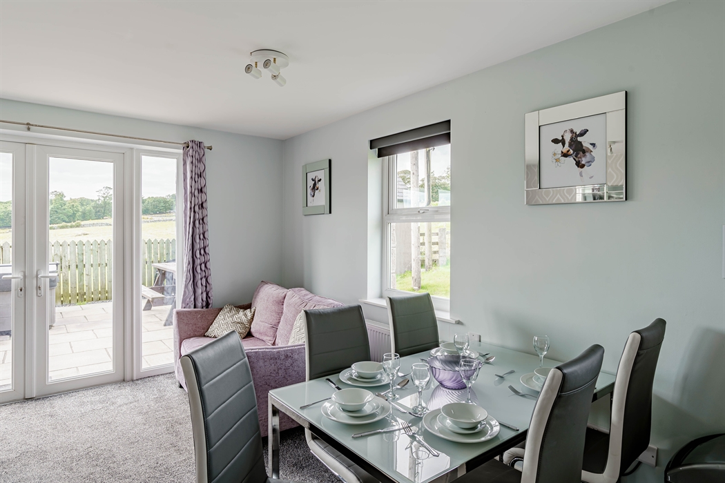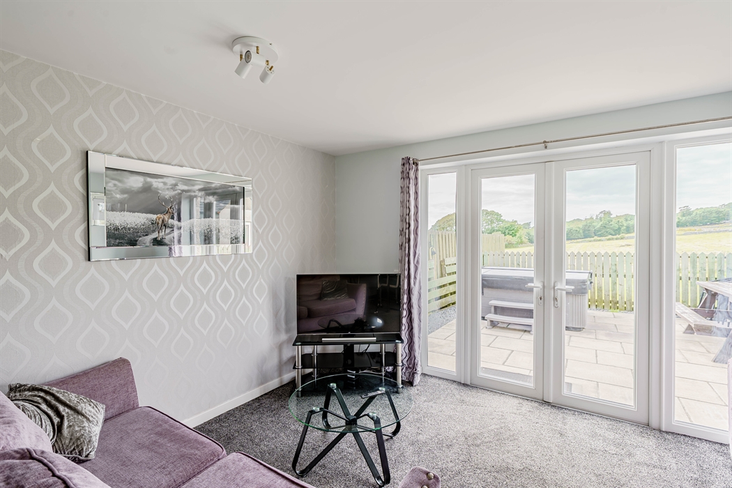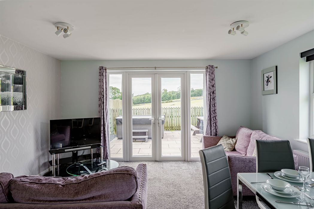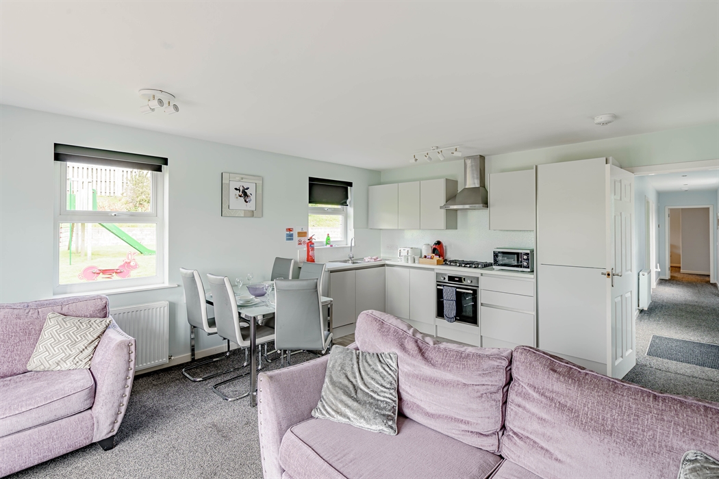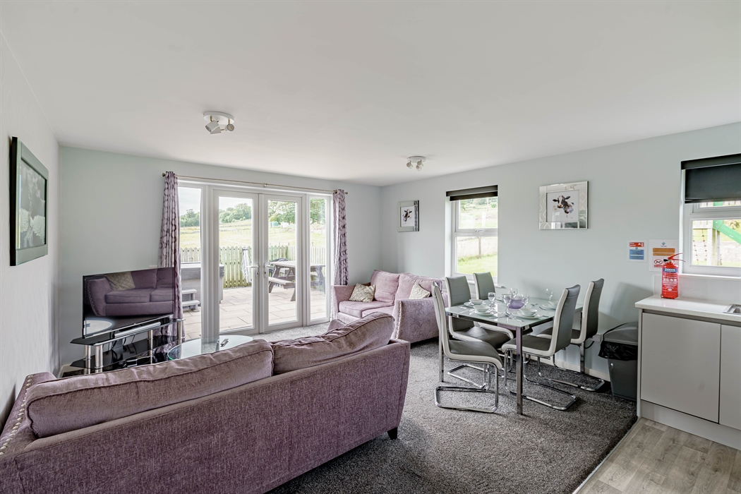 Accommodation for 5 all on one level: Spacious open plan kitchen and living area with doors leading to outside decking with Hot Tub; one step down to Double bedroom with ensuite shower room; Twin bedroom; Single bedroom; Family Shower Room.