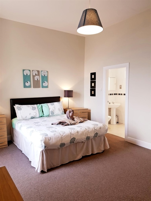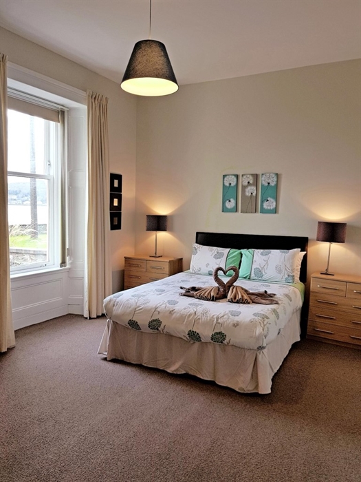 Directly opposite the living room is the master bedroom. This spacious room is front facing with a king size bed ideally placed so guests can enjoy the views on offer from the comfort of their own bed. There is also an en-suite shower room with this room.