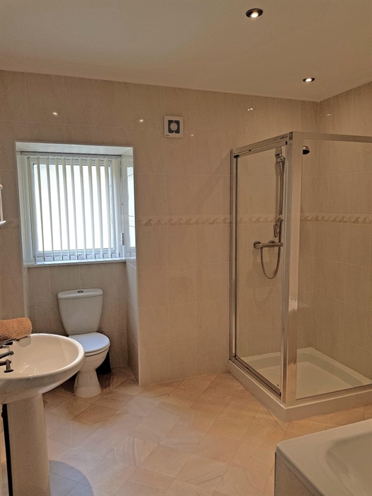 The large main bathroom is modern and bright and consists of a bath, walk-in shower, hand basin and w.c.