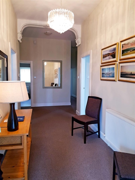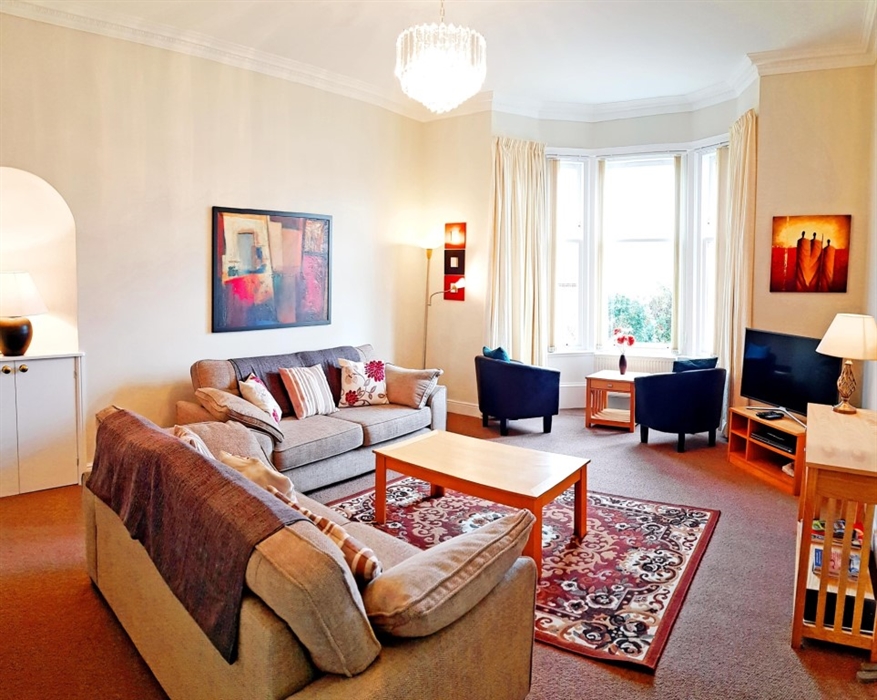 From the entrance door, the living room is on the right. This room is generous in size with high ceilings and bay window. Two overstuffed sofas offer comfortable seating to relax and unwind and two bucket chairs are ideally placed in the bay window where guests can absorb the stunning sea views on offer. The room also benefits from a smart TV, freesat box and DVD player and there are also a selection of books and games on offer for guests to enjoy.