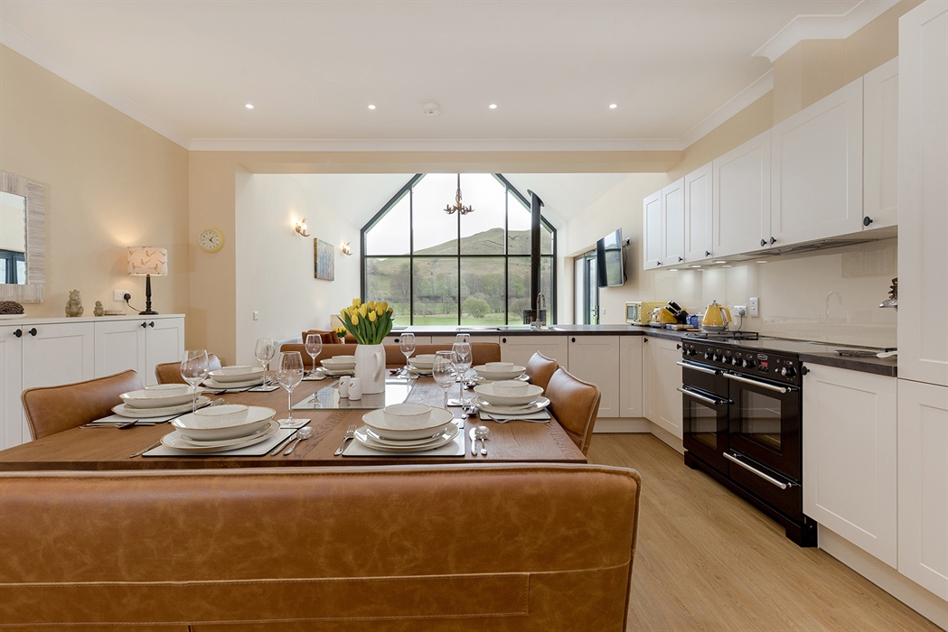 A large window wall within the kitchen/dining/living area showcases the spectacular surrounding countryside. The lounge will comfortably seat 8 and includes a wood burner, TV & DVD player.