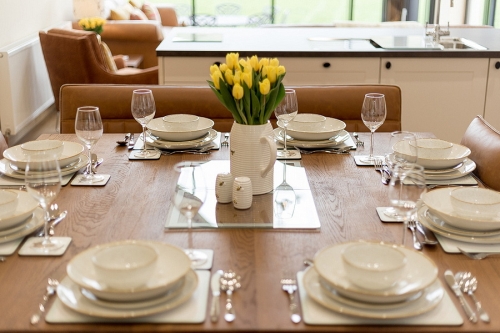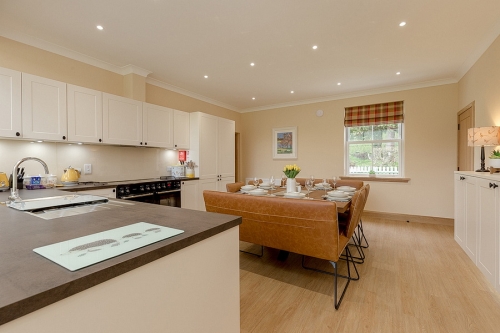 The kitchen/dining area sits just back from the lounge and has a newly fitted German kitchen, which has all the modern day appliances you would expect, including fridge/freezer, range cooker, microwave, toaster, kettle and dishwasher. This area also features a dining table seating 8 with ease.