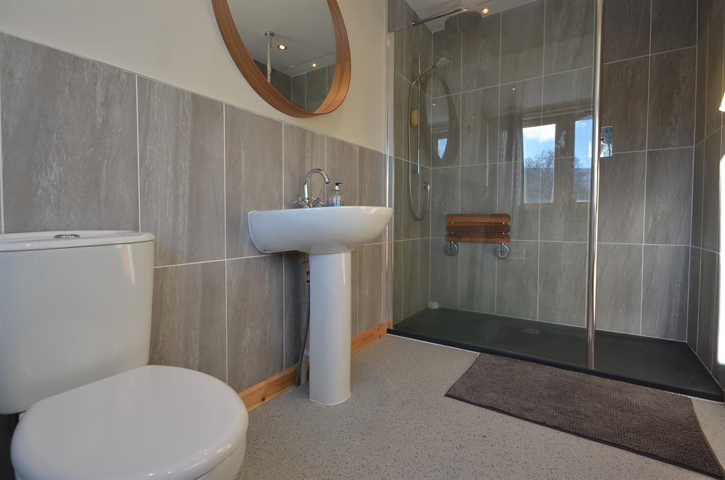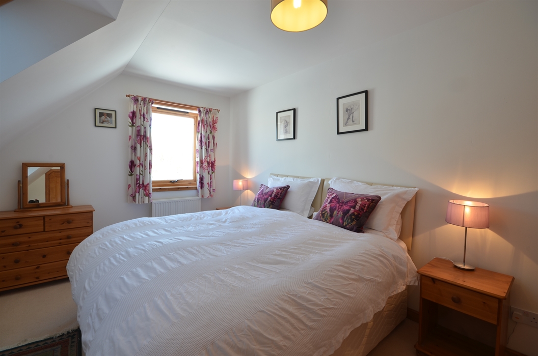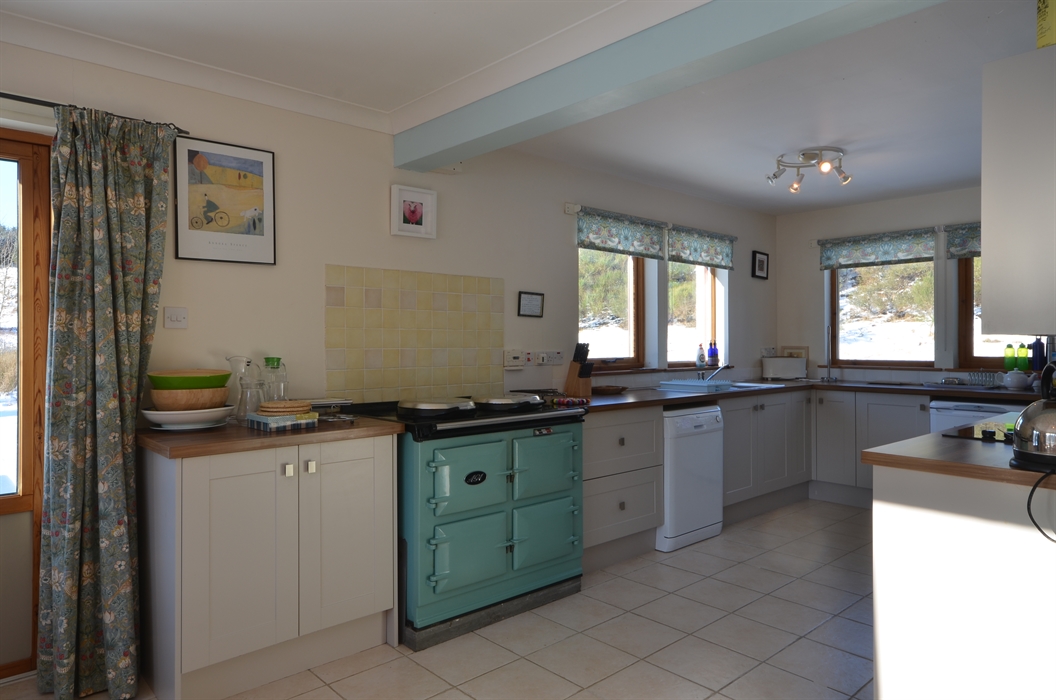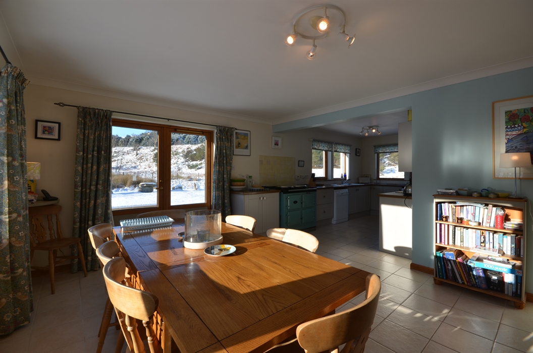 The open plan, L-shaped kitchen/dining area is kept toasty by the colourful three-oven electric Aga, although there is an electric hob and oven that provide useful backup. There is also a utility room off the kitchen that comes in very handy for storing climbing and walking gear.