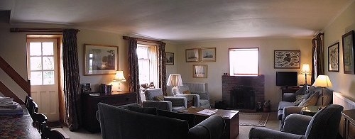 The main sitting room has been converted from the old barn. An unusual feature, the open fireplace has a window above it looking out to sea. The other end of the sitting room is the dining area, which seats 11. and leads into the kitchen.