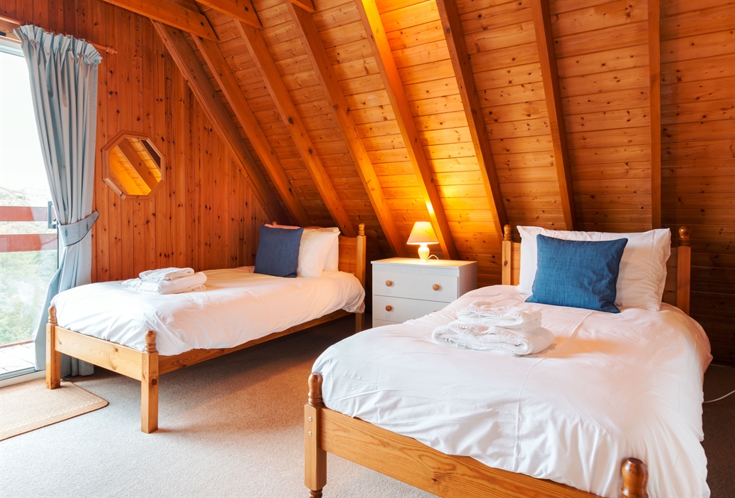 A large room with 2 single beds and patio doors leading to the balcony giving views of the lodges and Barend Loch.