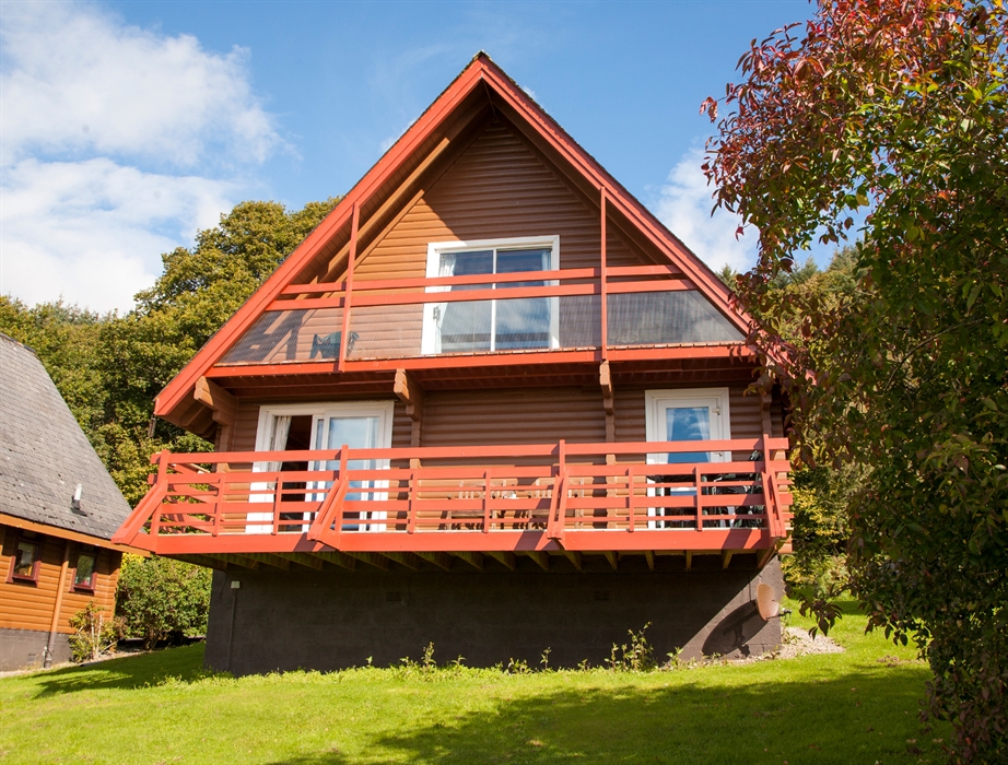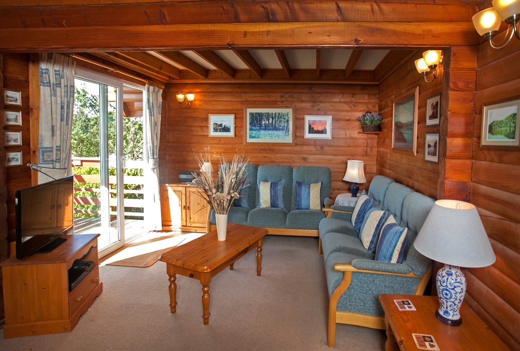 A large balcony with furniture is accessed through doors in the living area and gives a view of the lodges and loch.