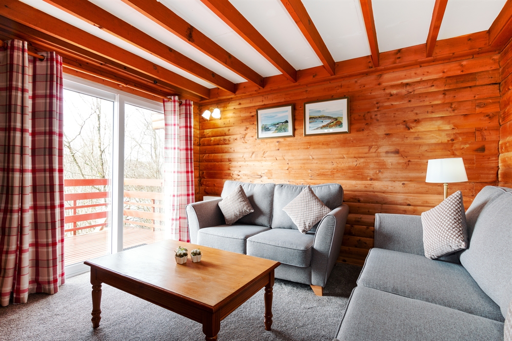 This two-storey wooden self catering holiday lodge has three bedrooms, a large open plan living dining area with separate kitchen and bathroom and two balconies with furniture.