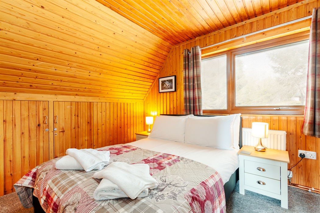 A king bed with wall mounted TV, ensuite toilet, shower and wash basin and patio doors leading to the balcony giving views of Dalbeattie Forest.
