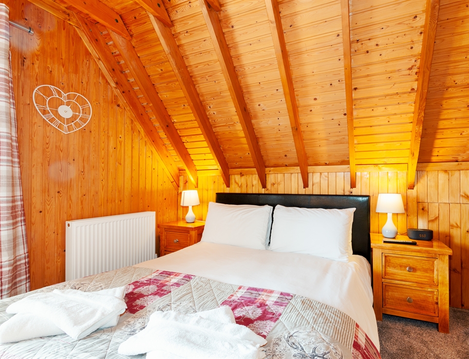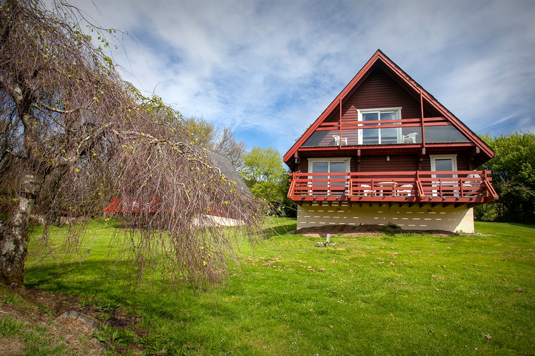 This two-storey wooden self catering holiday lodge has three separate bedrooms, a large open plan living dining area with separate kitchen and bathroom and two balconies with furniture.