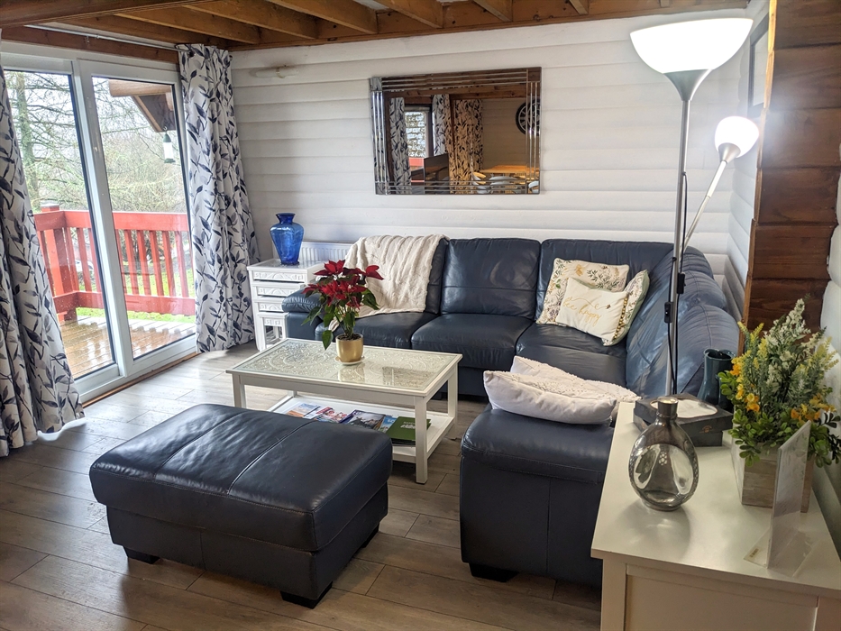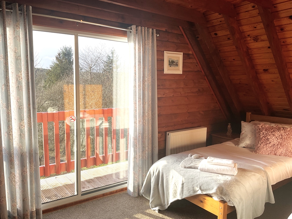 A large room with 2 single beds, a games nook, TV monitor and DVD player and patio doors leading to the balcony with views of Barend, the loch, the hillside & Dalbeattie Forest.