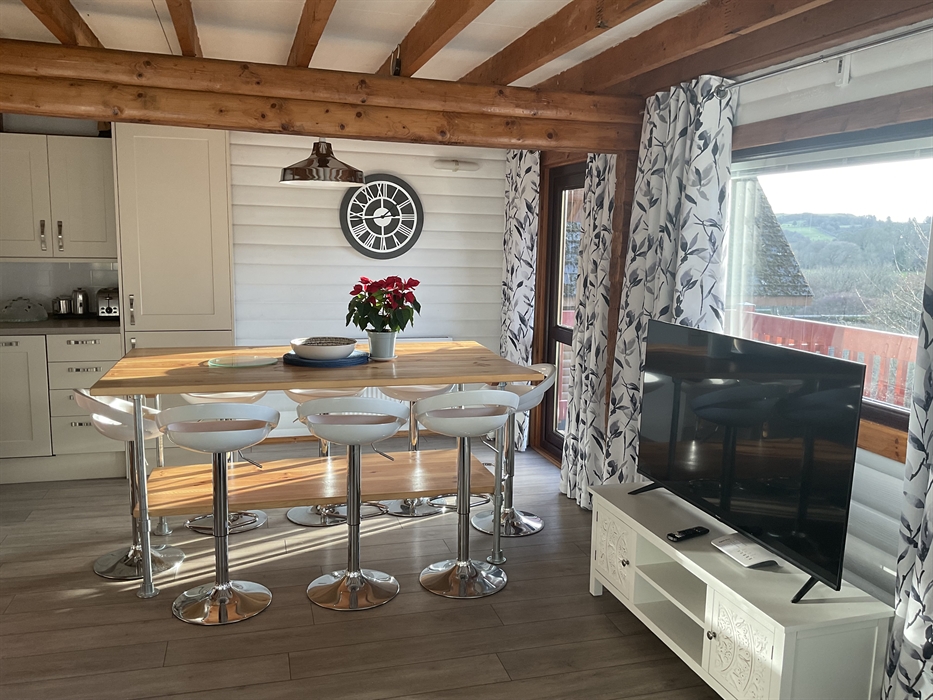 A large balcony with outdoor furniture and a view over the site and forest can be accessed through glass doors in the living and dining area.