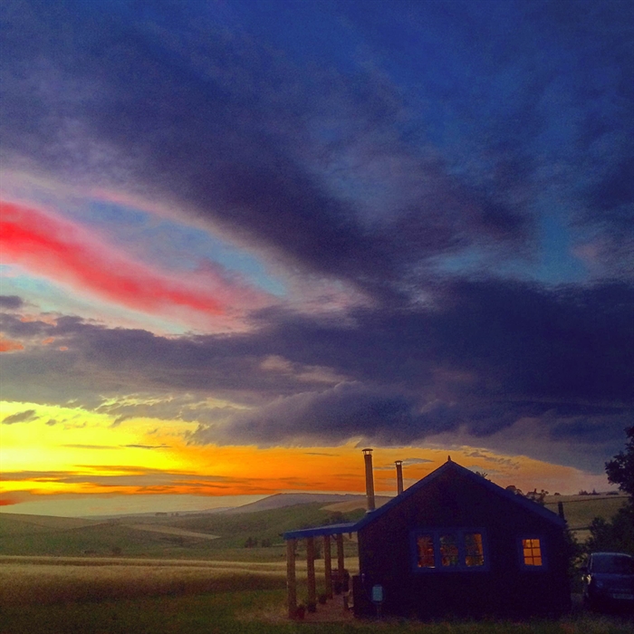 Our first wrinkly tin Scottish cabin surrounded by beautiful rural countryside. Made mostly from upcycled and repurposed materials the wooden interior was once a chicken shed!