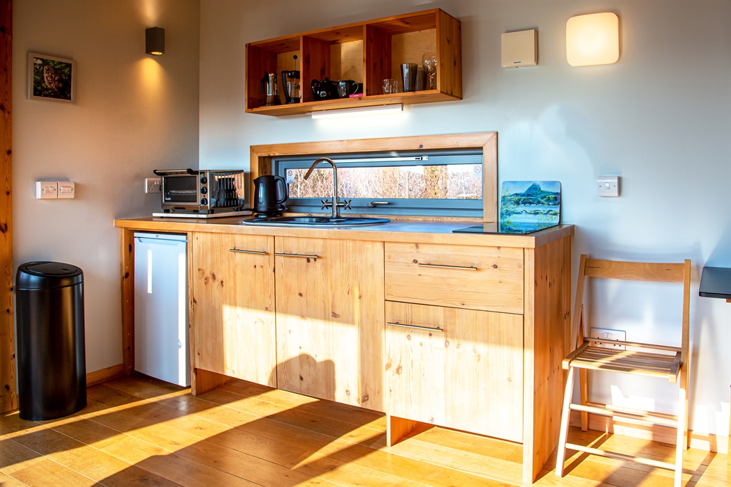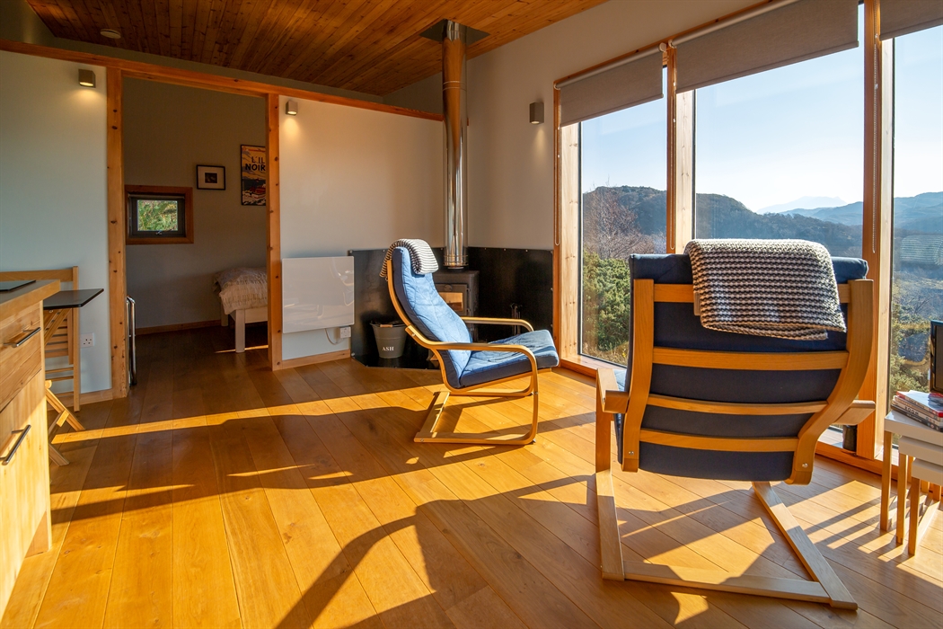 The Batbox is 26sqm. The high sloping roof and wonderful bright aspect create a roomy, luxurious space. Positioned higher up and further back on the croft with 2 metre high windows facing SSW, the cabin and deck area offer a fantastic panoramic view of Cul Mor and across Inverkirkaig’s tranquil sea loch and the wonderfully remote peninsular of Rubha na Breige. Sheep’s wool insulates the property throughout whilst hot water is powered by a mini, Norwegian-manufactured, boiler system. The main room has a Morso Squirrel wood-burning stove keeping the cabin lovely and warm for those occasions when the weather turns inclement. The accommodation consists of a lounge / well equipped mini kitchen, oak floor, a separate cosy double bedroom, a shower/wet room with toilet and wash hand basin.