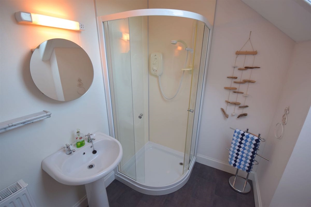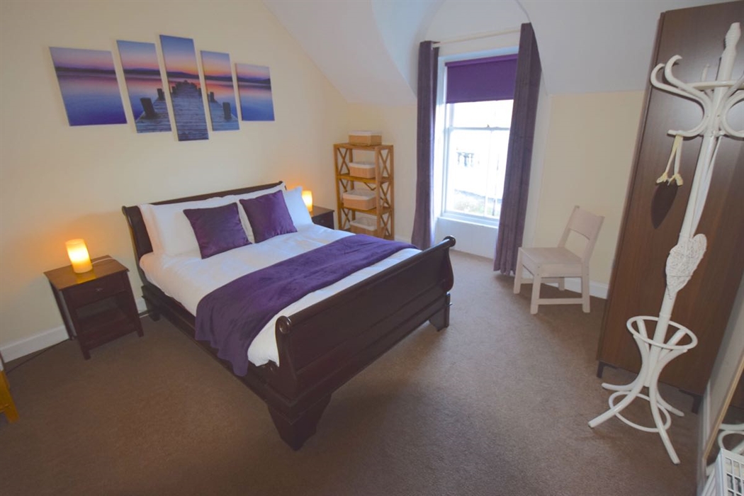 Bedroom 2: double bed, loch view, en-suite bath with shower over bath and WC.