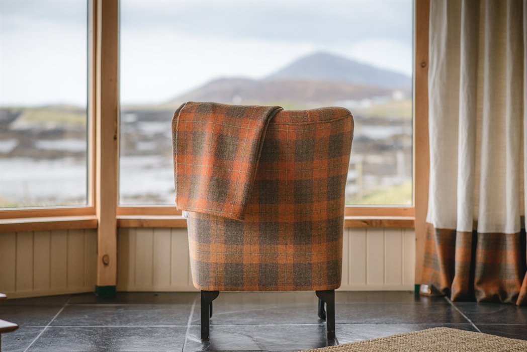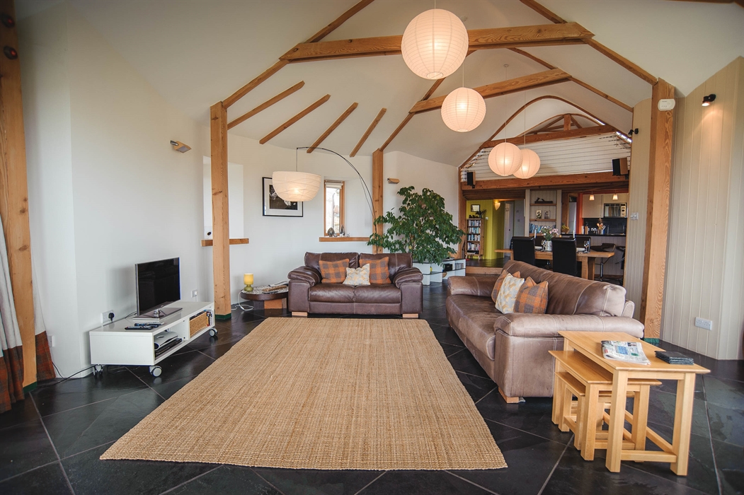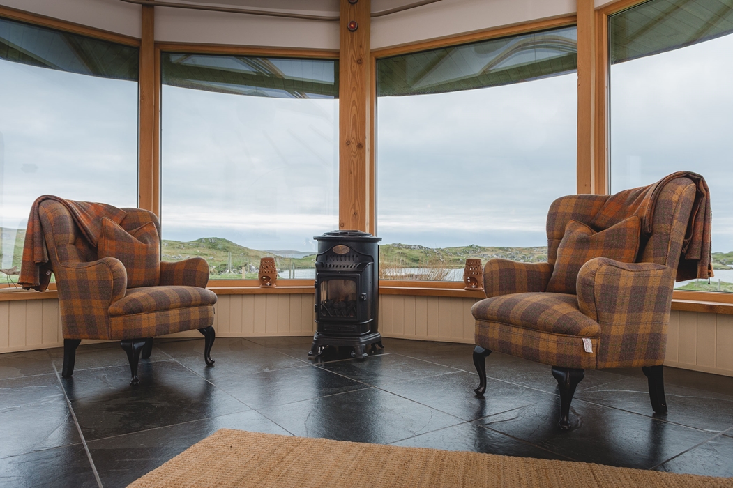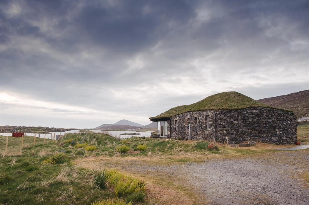 An architect designed contemporary renovation of a traditional Hebridean Blackhouse. Accommodation is for 2 adults in a downstairs master bedroom. There is a galleried sleeping platform with a king-sized bed if desired. The house is not suitable for children under the age of 14 years. The house does not take pets.
